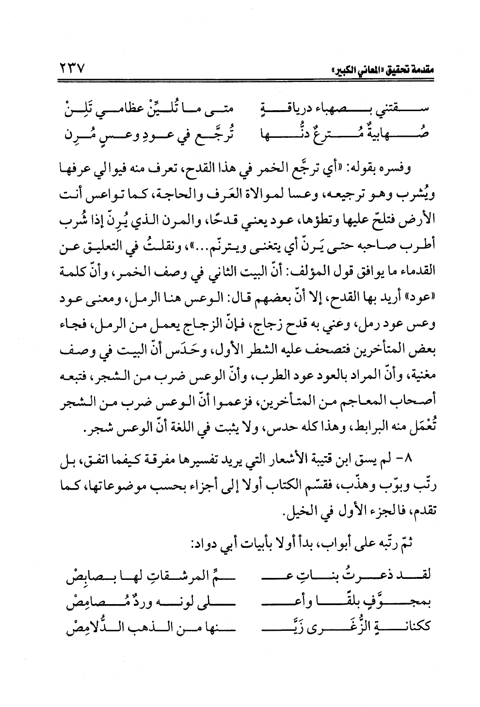 ٨ - لم يسق ابن قتيبة الأشعار التي يريد تفسيرها مفرقة كيفما اتفق، بل رتّب وبوّب وهذّب، فقسّم الكتاب أولا إلى أجزاء بحسب موضوعاتها، كما تقدم، فالجزء الأول في الخيل.