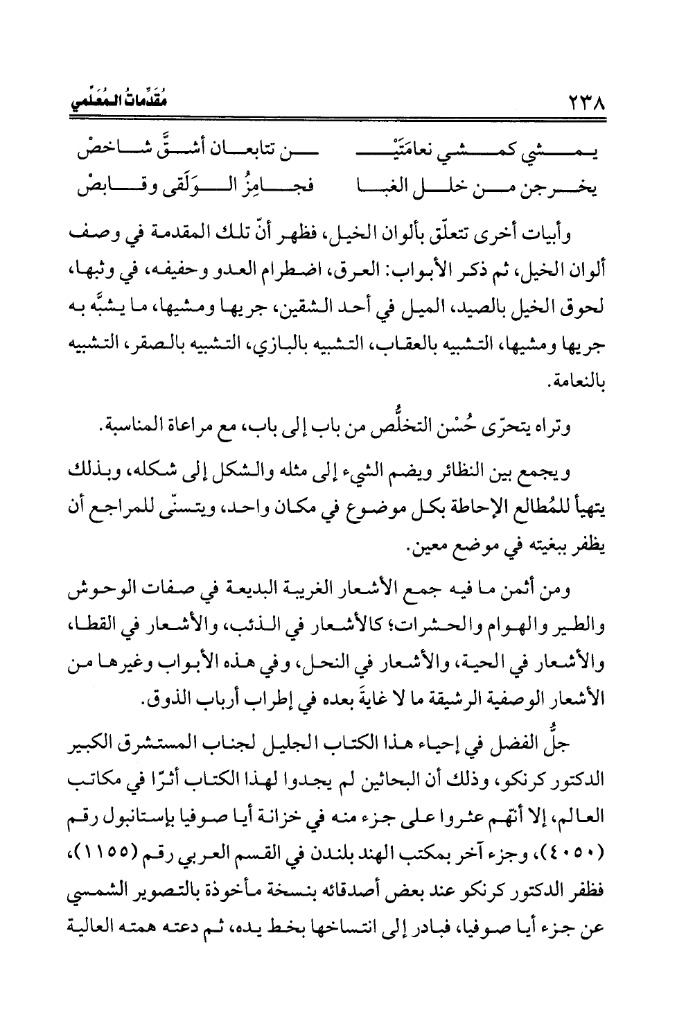 وأبيات أخرى تتعلّق بألوان الخيل، فظهر أنّ تلك المقدمة في وصف ألوان الخيل، ثم ذكر الأبواب: العرق، اضطرام العدو وحفيفه، في وثبها، لحوق الخيل بالصيد، الميل في أحد الشقين، جريها ومشيها، ما يشبَّه به جريها ومشيها، التشبيه بالعقاب، التشبيه بالبازي، التشبيه بالصقر، التشبيه بالنعامة.