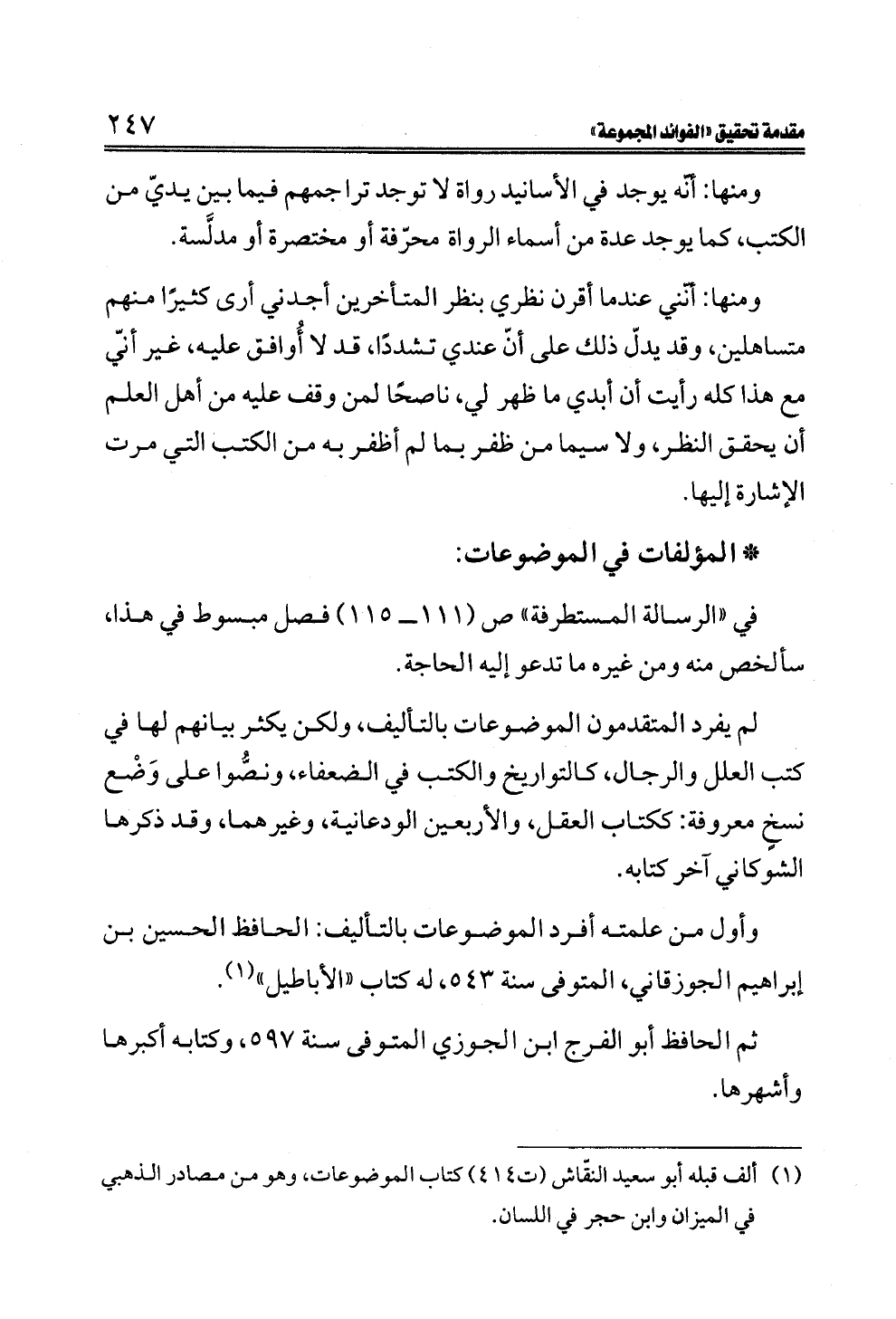 وأول من علمته أفرد الموضوعات بالتأليف: الحافظ الحسين بن إبراهيم الجوزقاني، المتوفى سنة ٥٤٣، له كتاب "الأباطيل" (¬١).