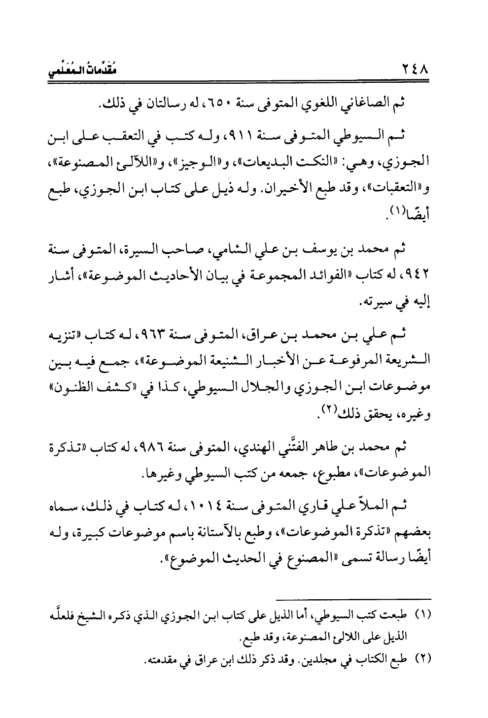 ثم السيوطي المتوفى سنة ٩١١، وله كتب في التعقب على ابن الجوزي، وهي: "النكت البديعات"، و"الوجيز"، و"اللآلئ المصنوعة"، و"التعقبات"، وقد طبع الأخيران. وله ذيل على كتاب ابن الجوزي، طبع أيضًا (¬١).