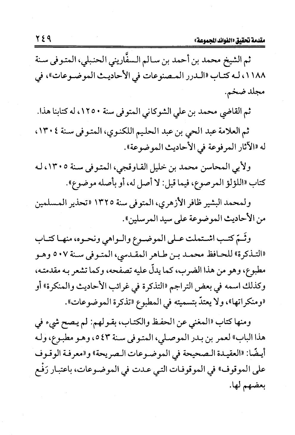 ثم الشيخ محمد بن أحمد بن سالم السفَّاريني الحنبلي، المتوفى سنة ١١٨٨، له كتاب "الدرر المصنوعات في الأحاديث الموضوعات"، في مجلد ضخم.