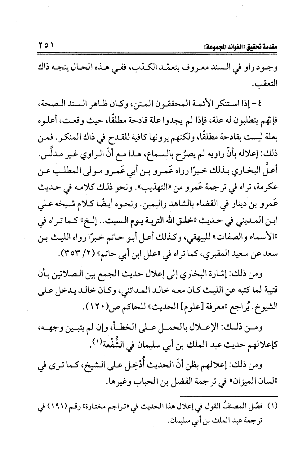 ٤ - إذا استنكر الأئمة المحققون المتن، وكان ظاهر السند الصحة، فإنّهم يتطلبون له علة، فإذا لم يجدوا علة قادحة مطلقًا، حيث وقعت، أعلوه بعلة ليست بقادحة مطلقًا، ولكنهم يرونها كافية للقدح في ذاك المنكر. فمن ذلك: إعلاله بأنّ راويه لم يصرِّح بالسماع، هذا مع أنّ الراوي غير مدلِّس. أعلَّ البخاري بذلك خبرًا رواه عَمرو بن أبي عَمرو مولى المطلب عن عكرمة، تراه في ترجمة عَمرو من "التهذيب". ونحو ذلك كلامه في حديث عَمرو بن دينار في القضاء بالشاهد واليمين. ونحوه أيضًا كلام شيخه علي ابن المديني في حديث "خلق الله التربة يوم السبت .. إلخ" كما تراه في "الأسماء والصفات" للبيهقي، وكذلك أعل أبو حاتم خبرًا رواه الليث بن سعد عن سعيد المقبري، كما تراه في "علل ابن أبي حاتم" (٢/ ٣٥٣).