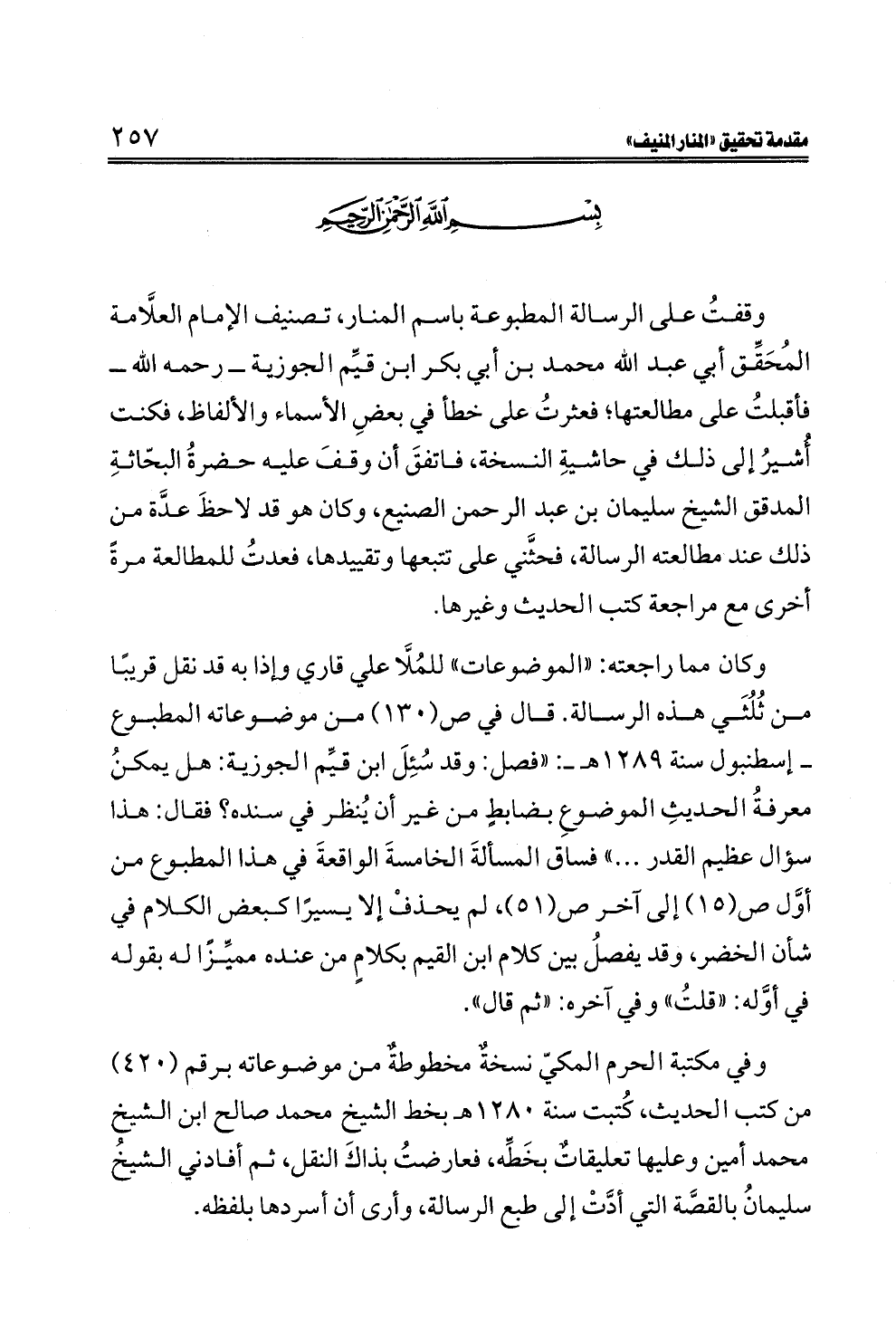 وقفتُ على الرسالة المطبوعة باسم المنار، تصنيف الإمام العلَّامة المُحَقِّق أبي عبد الله محمد بن أبي بكر ابن قيِّم الجوزية ــ رحمه الله ــ فأقبلتُ على مطالعتها؛ فعثرتُ على خطأ في بعضِ الأسماء والألفاظ، فكنت أُشيرُ إلى ذلك في حاشيةِ النسخة، فاتفقَ أن وقفَ عليه حضرةُ البحّاثةِ المدقق الشيخ سليمان بن عبد الرحمن الصنيع، وكان هو قد لاحظَ عدَّة من ذلك عند مطالعته الرسالة، فحثَّني على تتبعها وتقييدها، فعدتُ للمطالعة مرةً أخرى مع مراجعة كتب الحديث وغيرها.
