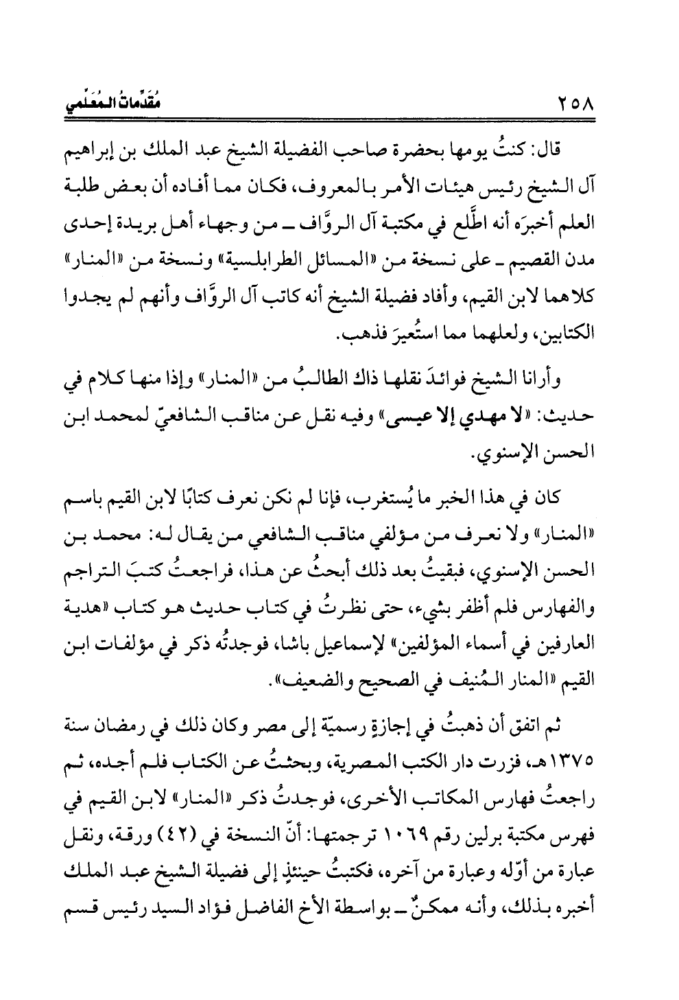 ثم اتفق أن ذهبتُ في إجازةٍ رسميّة إلى مصر وكان ذلك في رمضان سنة ١٣٧٥ هـ، فزرت دار الكتب المصرية، وبحثتُ عن الكتاب فلم أجده، ثم راجعتُ فهارس المكاتب الأخرى، فوجدتُ ذكر "المنار" لابن القيم في فهرس مكتبة برلين رقم ١٠٦٩ ترجمتها: أنّ النسخة في (٤٢) ورقة، ونقل عبارة من أوّله وعبارة من آخره، فكتبتُ حينئذٍ إلى فضيلة الشيخ عبد الملك أخبره بذلك، وأنه ممكنٌ ــ بواسطة الأخ الفاضل فؤاد السيد رئيس قسم