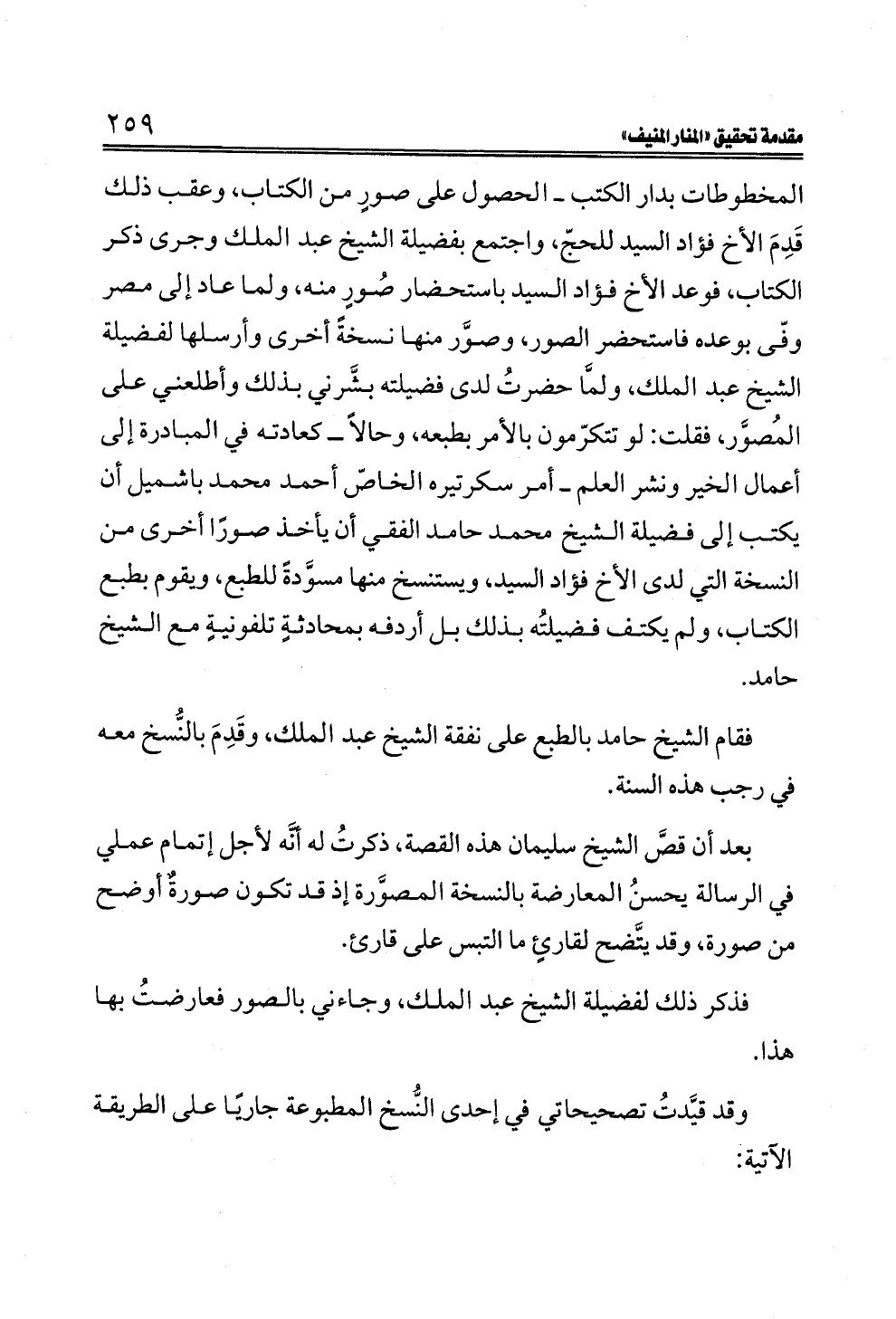 المخطوطات بدار الكتب ــ الحصول على صورٍ من الكتاب، وعقب ذلك قَدِمَ الأخ فؤاد السيد للحجّ، واجتمع بفضيلة الشيخ عبد الملك وجرى ذكر الكتاب، فوعد الأخ فؤاد السيد باستحضار صُورٍ منه، ولما عاد إلى مصر وفّى بوعده فاستحضر الصور، وصوَّر منها نسخةً أخرى وأرسلها لفضيلة الشيخ عبد الملك، ولمَّا حضرتُ لدى فضيلته بشَّرني بذلك وأطلعني على المُصوَّر، فقلت: لو تتكرّمون بالأمر بطبعه، وحالاً ــ كعادته في المبادرة إلى أعمال الخير ونشر العلم ــ أمر سكرتيره الخاصّ أحمد محمد باشميل أن يكتب إلى فضيلة الشيخ محمد حامد الفقي أن يأخذ صورًا أخرى من النسخة التي لدى الأخ فؤاد السيد، ويستنسخ منها مسوَّدةً للطبع، ويقوم بطبع الكتاب، ولم يكتف فضيلتُه بذلك بل أردفه بمحادثةٍ تلفونيةٍ مع الشيخ حامد.