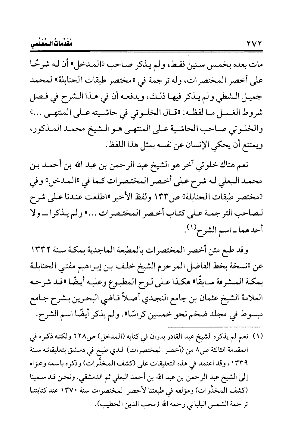 (¬١) نعم لم يذكره الشيخ عبد القادر بدران في كتابه (المدخل) ص ٢٢٨ ولكنه ذكره في المقدمة الثالثة ص ٨ من (أخصر المختصرات) الذي طبع في دمشق بتعليقاته سنة ١٣٣٩، وقد اعتمد في هذه التعليقات على (كشف المخدَّرات) وذكره باسمه وعزاه إلى الشيخ عبد الرحمن بن عبد الله بن أحمد البعلي ثم الدمشقي. ونحن قد سمينا (كشف المخدَّرات) ومؤلفه في طبعتنا لأخصر المختصرات سنة ١٣٧٠ عند كتابتنا ترجمة الشمس البلباني رحمه الله (محب الدين الخطيب).