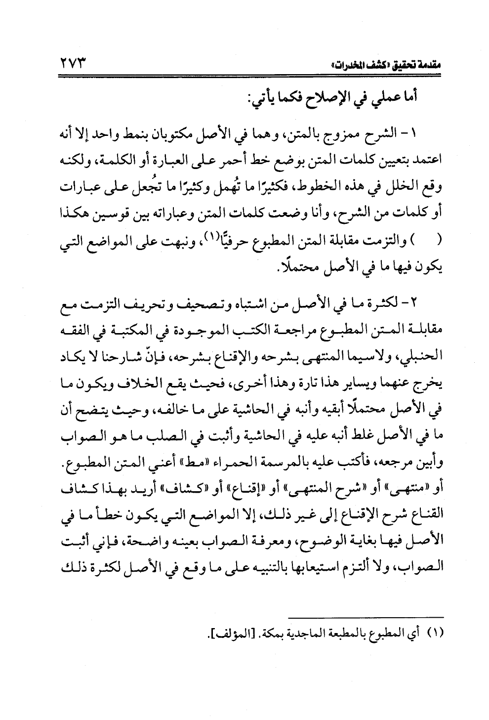 ٢ - لكثرة ما في الأصل من اشتباه وتصحيف وتحريف التزمت مع مقابلة المتن المطبوع مراجعة الكتب الموجودة في المكتبة في الفقه الحنبلي، ولاسيما المنتهى بشرحه والإقناع بشرحه، فإنّ شارحنا لا يكاد يخرج عنهما ويساير هذا تارة وهذا أخرى، فحيث يقع الخلاف ويكون ما في الأصل محتملًا أبقيه وأنبه في الحاشية على ما خالفه، وحيث يتضح أن ما في الأصل غلط أنبه عليه في الحاشية وأثبت في الصلب ما هو الصواب وأبين مرجعه، فأكتب عليه بالمرسمة الحمراء "مط" أعني المتن المطبوع. أو "منتهى" أو "شرح المنتهى" أو "إقناع" أو "كشاف" أريد بهذا كشاف القناع شرح الإقناع إلى غير ذلك، إلا المواضع التي يكون خطأ ما في الأصل فيها بغاية الوضوح، ومعرفة الصواب بعينه واضحة، فإني أثبت الصواب، ولا ألتزم استيعابها بالتنبيه على ما وقع في الأصل لكثرة ذلك