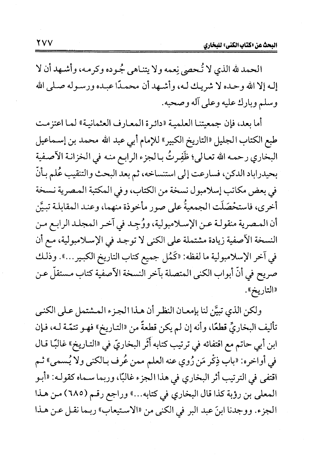 أما بعد، فإن جمعيتنا العلمية «دائرة المعارف العثمانية» لما اعتزمت طبع الكتاب الجليل «التاريخ الكبير» للإمام أبي عبد الله محمد بن إسماعيل البخاري رحمه الله تعالى؛ ظَفِرتُ بالجزء الرابع منه في الخزانة الآصفية بحيدراباد الدكن، فسارعت إلى استنساخه، ثم بعد البحث والتنقيب عُلم بأنّ في بعض مكاتب إسلامبول نسخة من الكتاب، وفي المكتبة المصرية نسخة أخرى، فاستحْصَلَت الجمعيةُ على صور مأخوذة منهما، وعند المقابلة تبيَّن أن المصرية منقولة عن الإسلامبولية، ووُجِد في آخر المجلد الرابع من النسخة الآصفية زيادة مشتملة على الكنى لا توجد في الإسلامبولية، مع أن في آخر الإسلامبولية ما لفظه: «كَمُل جميع كتاب التاريخ الكبير ... ». وذلك صريح في أنّ أبواب الكنى المتصلة بآخر النسخة الآصفية كتاب مستقلّ عن «التاريخ».