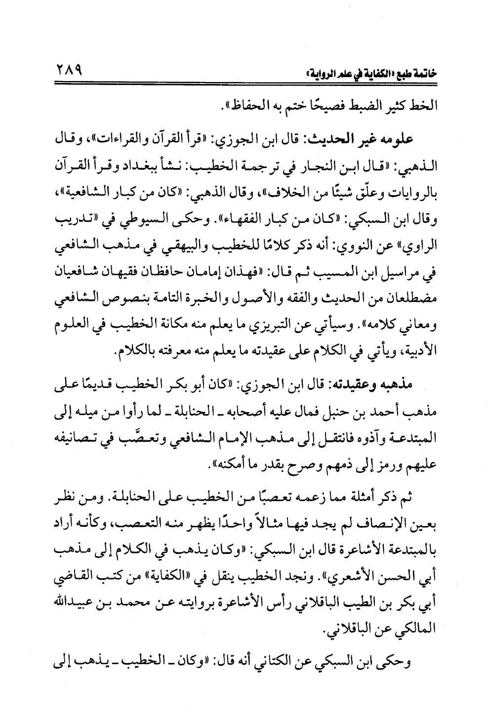 ثم ذكر أمثلة مما زعمه تعصبًا من الخطيب على الحنابلة. ومن نظر بعين الإنصاف لم يجد فيها مثالاً واحدًا يظهر منه التعصب، وكأنه أراد بالمبتدعة الأشاعرة قال ابن السبكي: "وكان يذهب في الكلام إلى مذهب أبي الحسن الأشعري". ونجد الخطيب ينقل في "الكفاية" من كتب القاضي أبي بكر بن الطيب الباقلاني رأس الأشاعرة بروايته عن محمد بن عبيدالله المالكي عن الباقلاني.