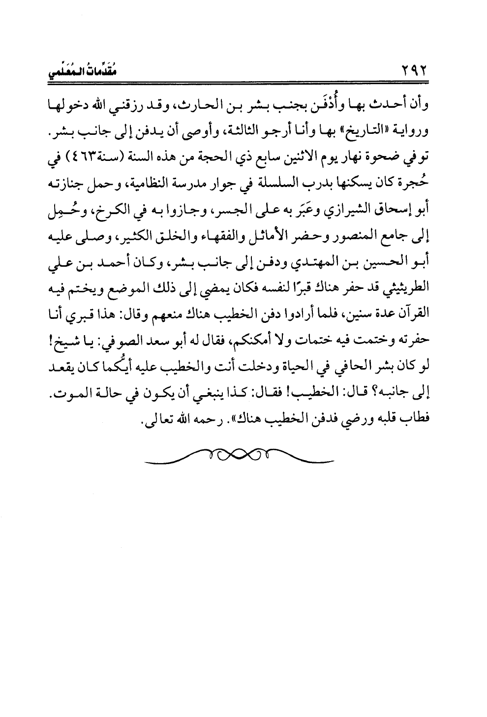 وأن أحدث بها وأُدْفَن بجنب بشر بن الحارث، وقد رزقني الله دخولها ورواية "التاريخ" بها وأنا أرجو الثالثة، وأوصى أن يدفن إلى جانب بشر. توفي ضحوة نهار يوم الاثنين سابع ذي الحجة من هذه السنة (سنة ٤٦٣) في حُجرة كان يسكنها بدرب السلسلة في جوار مدرسة النظامية، وحمل جنازته أبو إسحاق الشيرازي وعَبَر به على الجسر، وجازوا به في الكرخ، وحُمِل إلى جامع المنصور وحضر الأماثل والفقهاء والخلق الكثير، وصلى عليه أبو الحسين بن المهتدي ودفن إلى جانب بشر، وكان أحمد بن علي الطريثيثي قد حفر هناك قبرًا لنفسه فكان يمضي إلى ذلك الموضع ويختم فيه القرآن عدة سنين، فلما أرادوا دفن الخطيب هناك منعهم وقال: هذا قبري أنا حفرته وختمت فيه ختمات ولا أمكنكم، فقال له أبو سعد الصوفي: يا شيخ! لو كان بشر الحافي في الحياة ودخلت أنت والخطيب عليه أيُّكما كان يقعد إلى جانبه؟ قال: الخطيب! فقال: كذا ينبغي أن يكون في حالة الموت. فطاب قلبه ورضي فدفن الخطيب هناك". رحمه الله تعالى.