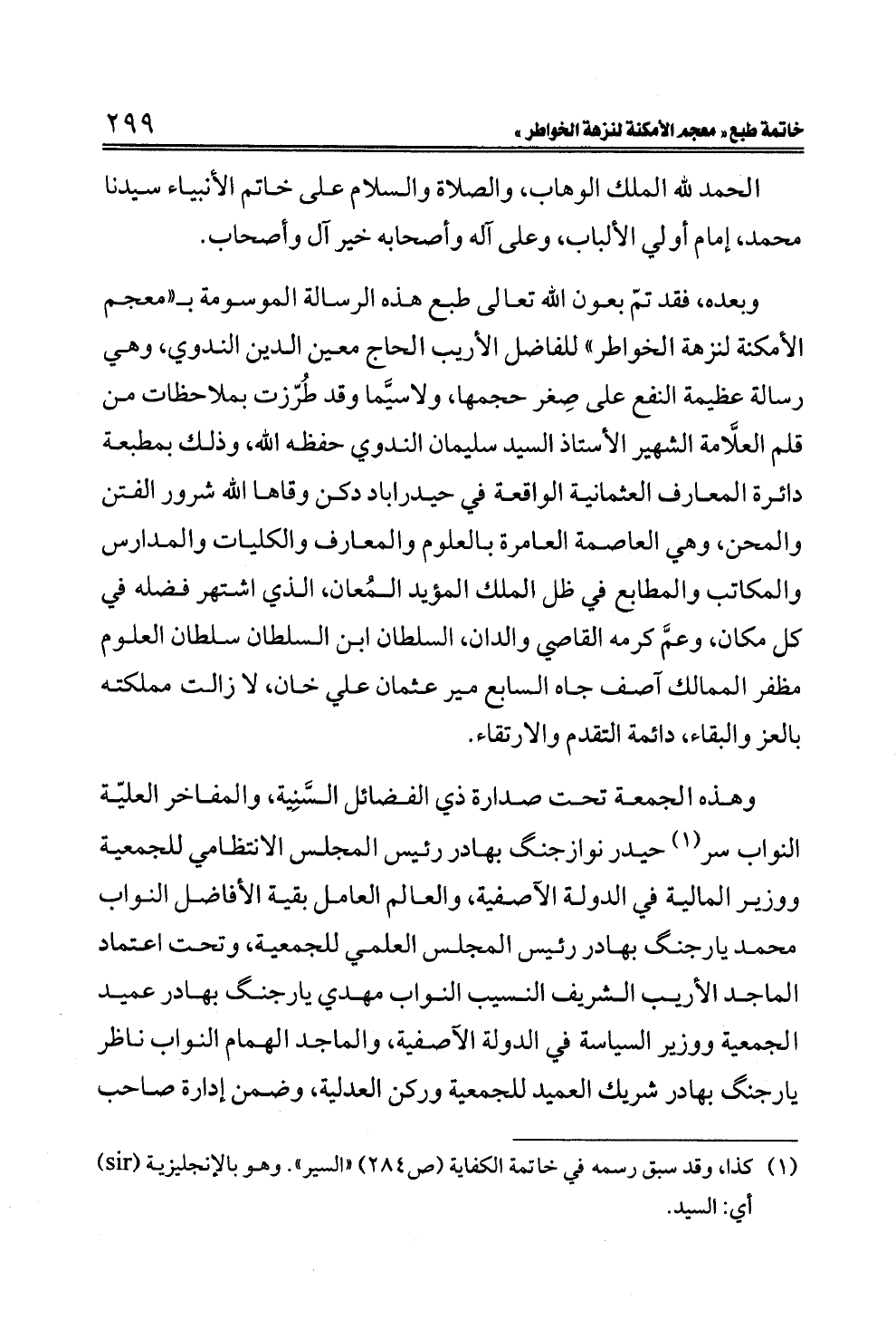 وبعده، فقد تمّ بعون الله تعالى طبع هذه الرسالة الموسومة بـ «معجم الأمكنة لنزهة الخواطر» للفاضل الأريب الحاج معين الدين الندوي، وهي رسالة عظيمة النفع على صِغر حجمها، ولاسيَّما وقد طُرّزت بملاحظات من قلم العلَّامة الشهير الأستاذ السيد سليمان الندوي حفظه الله، وذلك بمطبعة دائرة المعارف العثمانية الواقعة في حيدراباد دكن وقاها الله شرور الفتن والمحن، وهي العاصمة العامرة بالعلوم والمعارف والكليات والمدارس والمكاتب والمطابع في ظل الملك المؤيد المُعان، الذي اشتهر فضله في كل مكان، وعمَّ كرمه القاصي والدان، السلطان ابن السلطان سلطان العلوم مظفر الممالك آصف جاه السابع مير عثمان علي خان، لا زالت مملكته بالعز والبقاء، دائمة التقدم والارتقاء.