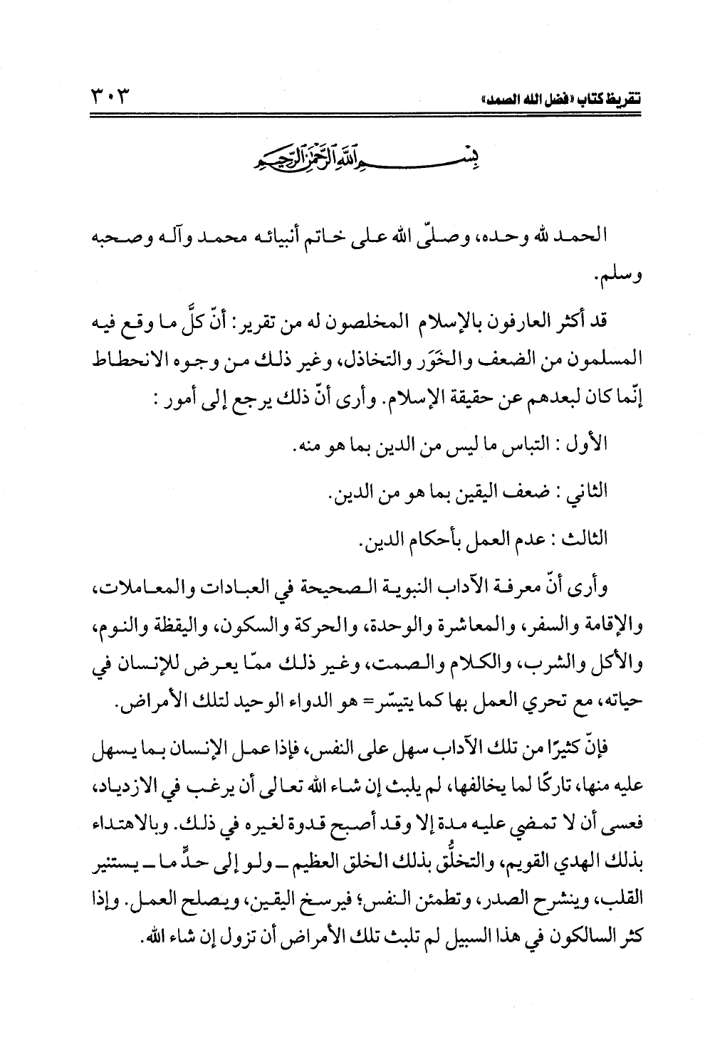 وأرى أنّ معرفة الآداب النبوية الصحيحة في العبادات والمعاملات، والإقامة والسفر، والمعاشرة والوحدة، والحركة والسكون، واليقظة والنوم، والأكل والشرب، والكلام والصمت، وغير ذلك ممّا يعرض للإنسان في حياته، مع تحري العمل بها كما يتيسّر= هو الدواء الوحيد لتلك الأمراض.