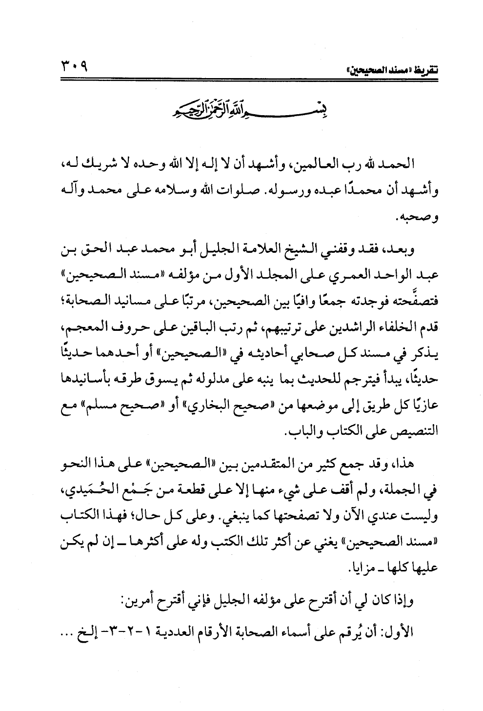 وبعد، فقد وقفني الشيخ العلامة الجليل أبو محمد عبد الحق بن عبد الواحد العمري على المجلد الأول من مؤلفه "مسند الصحيحين" فتصفَّحته فوجدته جمعًا وافيًا بين الصحيحين، مرتبًا على مسانيد الصحابة؛ قدم الخلفاء الراشدين على ترتيبهم، ثم رتب الباقين على حروف المعجم، يذكر في مسند كل صحابي أحاديثه في "الصحيحين" أو أحدهما حديثًا حديثًا، يبدأ فيترجم للحديث بما ينبه على مدلوله ثم يسوق طرقه بأسانيدها عازيًا كل طريق إلى موضعها من "صحيح البخاري" أو "صحيح مسلم" مع التنصيص على الكتاب والباب.