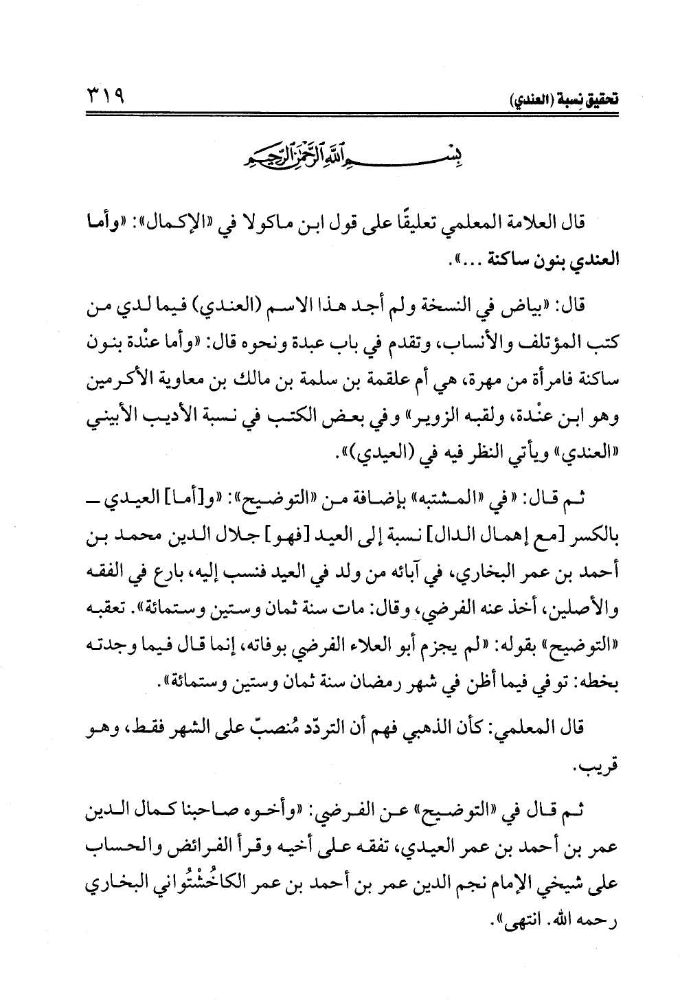 ثم قال: "في "المشتبه" بإضافة من "التوضيح": "و [أما] العيدي ــ بالكسر [مع إهمال الدال] نسبة إلى العيد [فهو] جلال الدين محمد بن أحمد بن عمر البخاري، في آبائه من ولد في العيد فنسب إليه، بارع في الفقه والأصلين، أخذ عنه الفرضي، وقال: مات سنة ثمان وستين وستمائة". تعقبه "التوضيح" بقوله: "لم يجزم أبو العلاء الفرضي بوفاته، إنما قال فيما وجدته بخطه: توفي فيما أظن في شهر رمضان سنة ثمان وستين وستمائة".