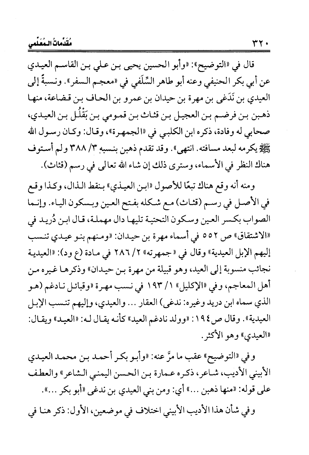 قال في "التوضيح": "وأبو الحسين يحيى بن علي بن القاسم العيدي عن أبي بكر الحنيفي وعنه أبو طاهر السِّلَفي في "معجم السفر". ونسبةً إلى العيدي بن نَدَغى بن مهرة بن حيدان بن عمرو بن الحاف بن قضاعة، منها ذهبن بن فرضم بن العجيل بن قثاث بن قمومي بن بَقْلُل بن العيدي، صحابي له وفادة، ذكره ابن الكلبي في "الجمهرة"، وقال: وكان رسول الله - صلى الله عليه وسلم - يكرمه لبعد مسافته. انتهى". وقد تقدم ذهبن بنسبه ٣/ ٣٨٨ ولم أستوف هناك النظر في الأسماء، وسترى ذلك إن شاء الله تعالى في رسم (قثاث).