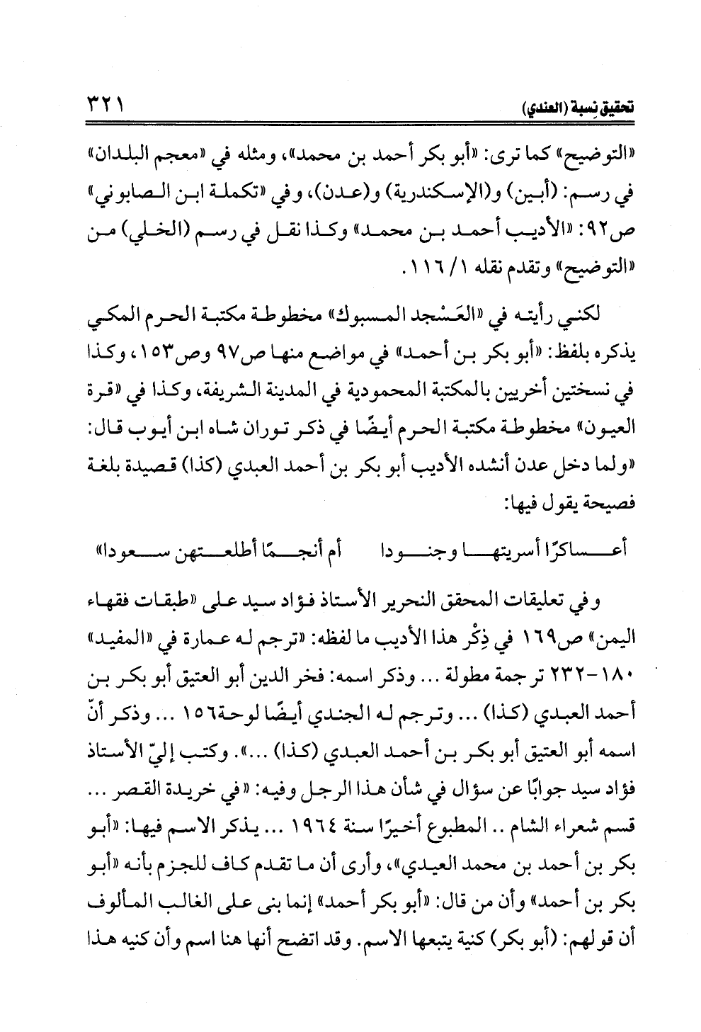 وفي تعليقات المحقق النحرير الأستاذ فؤاد سيد على "طبقات فقهاء اليمن" ص ١٦٩ في ذِكْر هذا الأديب ما لفظه: "ترجم له عمارة في "المفيد" ١٨٠ - ٢٣٢ ترجمة مطولة ... وذكر اسمه: فخر الدين أبو العتيق أبو بكر بن أحمد العبدي (كذا) ... وترجم له الجندي أيضًا لوحة ١٥٦ ... وذكر أنّ اسمه أبو العتيق أبو بكر بن أحمد العبدي (كذا) ... ". وكتب إليّ الأستاذ فؤاد سيد جوابًا عن سؤال في شأن هذا الرجل وفيه: "في خريدة القصر ... قسم شعراء الشام .. المطبوع أخيرًا سنة ١٩٦٤ ... يذكر الاسم فيها: "أبو بكر بن أحمد بن محمد العيدي"، وأرى أن ما تقدم كاف للجزم بأنه "أبو بكر بن أحمد" وأن من قال: "أبو بكر أحمد" إنما بنى على الغالب المألوف أن قولهم: (أبو بكر) كنية يتبعها الاسم. وقد اتضح أنها هنا اسم وأن كنيه هذا