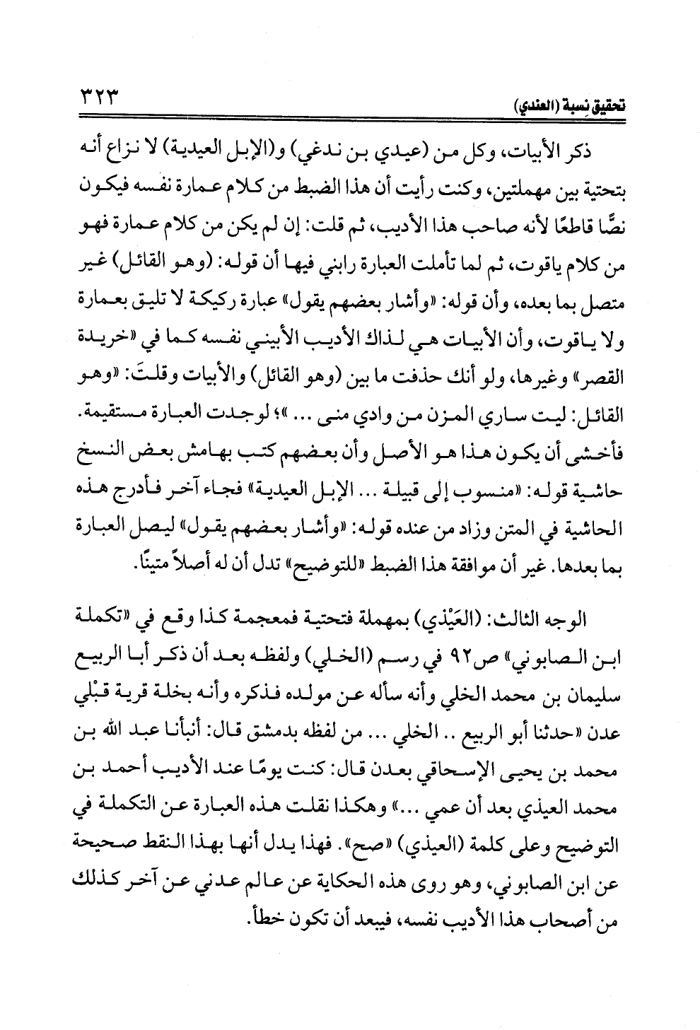 ذكر الأبيات، وكل من (عيدي بن ندغي) و (الإبل العيدية) لا نزاع أنه بتحتية بين مهملتين، وكنت رأيت أن هذا الضبط من كلام عمارة نفسه فيكون نصًّا قاطعًا لأنه صاحب هذا الأديب، ثم قلت: إن لم يكن من كلام عمارة فهو من كلام ياقوت، ثم لما تأملت العبارة رابني فيها أن قوله: (وهو القائل) غير متصل بما بعده، وأن قوله: "وأشار بعضهم يقول" عبارة ركيكة لا تليق بعمارة ولا ياقوت، وأن الأبيات هي لذاك الأديب الأبيني نفسه كما في "خريدة القصر" وغيرها، ولو أنك حذفت ما بين (وهو القائل) والأبيات وقلتَ: "وهو القائل: ليت ساري المزن من وادي منى ... "؛ لوجدت العبارة مستقيمة. فأخشى أن يكون هذا هو الأصل وأن بعضهم كتب بهامش بعض النسخ حاشية قوله: "منسوب إلى قبيلة ... الإبل العيدية" فجاء آخر فأدرج هذه الحاشية في المتن وزاد من عنده قوله: "وأشار بعضهم يقول" ليصل العبارة بما بعدها. غير أن موافقة هذا الضبط "للتوضيح" تدل أن له أصلاً متينًا.