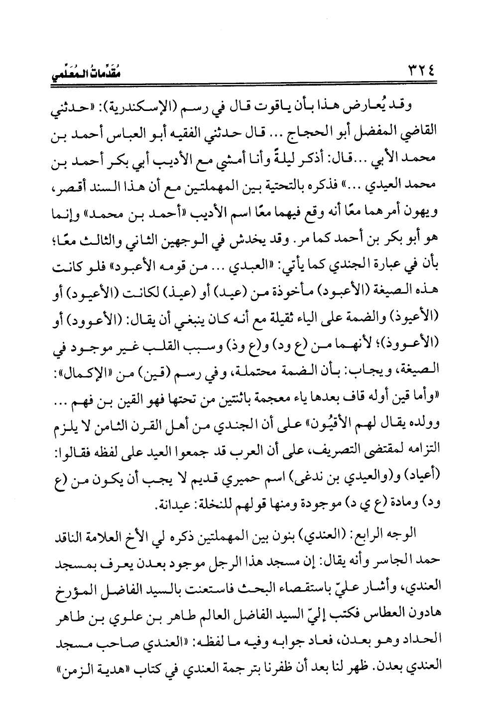 وقد يُعارض هذا بأن ياقوت قال في رسم (الإسكندرية): "حدثني القاضي المفضل أبو الحجاج ... قال حدثني الفقيه أبو العباس أحمد بن محمد الأبي ... قال: أذكر ليلةً وأنا أمشي مع الأديب أبي بكر أحمد بن محمد العيدي ... " فذكره بالتحتية بين المهملتين مع أن هذا السند أقصر، ويهون أمرهما معًا أنه وقع فيهما معًا اسم الأديب "أحمد بن محمد" وإنما هو أبو بكر بن أحمد كما مر. وقد يخدش في الوجهين الثاني والثالث معًا؛ بأن في عبارة الجندي كما يأتي: "العبدي ... من قومه الأعبود" فلو كانت هذه الصيغة (الأعبود) مأخوذة من (عيد) أو (عيذ) لكانت (الأعيود) أو (الأعيوذ) والضمة على الياء ثقيلة مع أنه كان ينبغي أن يقال: (الأعوود) أو (الأعووذ)؛ لأنهما من (ع ود) و (ع وذ) وسبب القلب غير موجود في الصيغة، ويجاب: بأن الضمة محتملة، وفي رسم (قين) من "الإكمال": "وأما قين أوله قاف بعدها ياء معجمة باثنتين من تحتها فهو القين بن فهم ... وولده يقال لهم الأقيُون" على أن الجندي من أهل القرن الثامن لا يلزم التزامه لمقتضى التصريف، على أن العرب قد جمعوا العيد على لفظه فقالوا: (أعياد) و (والعيدي بن ندغى) اسم حميري قديم لا يجب أن يكون من (ع ود) ومادة (ع ي د) موجودة ومنها قولهم للنخلة: عيدانة.