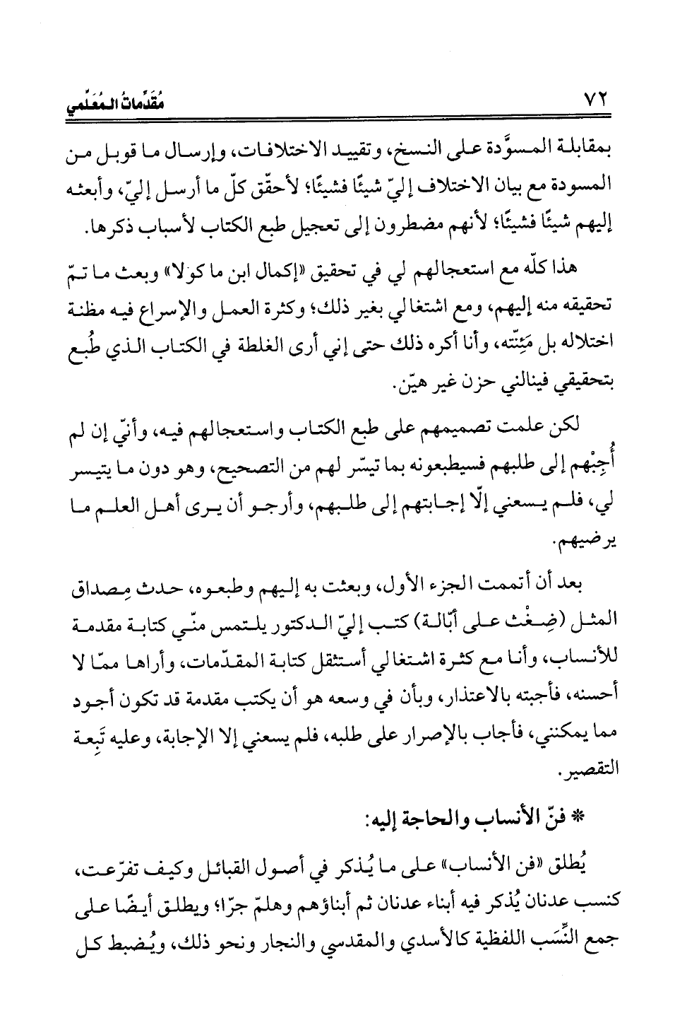 هذا كلّه مع استعجالهم لي في تحقيق "إكمال ابن ما كولا" وبعث ما تمّ تحقيقه منه إليهم، ومع اشتغالي بغير ذلك؛ وكثرة العمل والإسراع فيه مظنة اختلاله بل مَئِنّته، وأنا أكره ذلك حتى إني أرى الغلطة في الكتاب الذي طُبع بتحقيقي فينالني حزن غير هيّن.