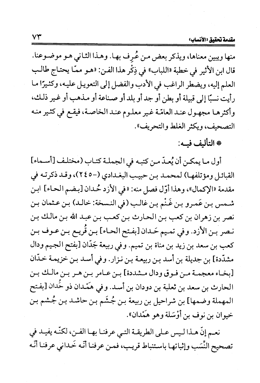 منها ويبين معناها، ويذكر بعض من عُرِف بها. وهذا الثاني هو موضوعنا. قال ابن الأثير في خطبة "اللباب" في ذِكْر هذا الفن: "هو ممّا يحتاج طالب العلم إليه، ويضطر الراغب في الأدب والفضل إلى التعويل عليه، وكثيرًا ما رأيت نسبًا إلى قبيلة أو بطن أو جد أو بلد أو صناعة أو مذهب أو غير ذلك، وأكثرها مجهول عند العامّة غير معلوم عند الخاصة، فيقع في كثير منه التصحيف، ويكثر الغلط والتحريف".
