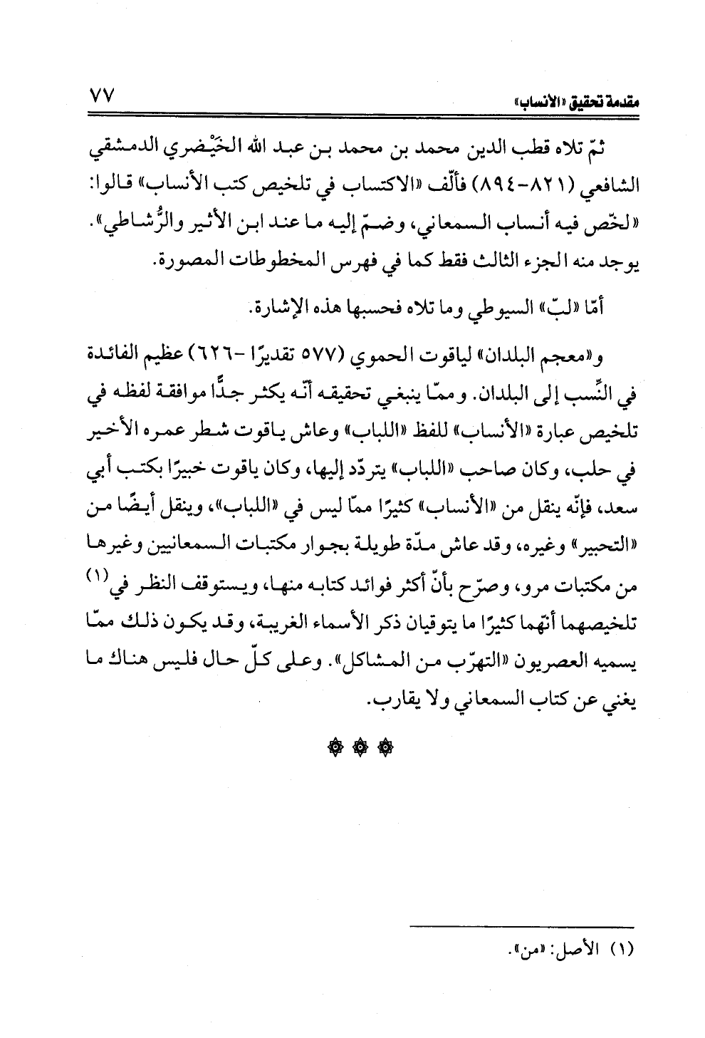 و"معجم البلدان" لياقوت الحموي (٥٧٧ تقديرًا -٦٢٦) عظيم الفائدة في النِّسب إلى البلدان. وممّا ينبغي تحقيقه أنّه يكثر جدًّا موافقة لفظه في تلخيص عبارة "الأنساب" للفظ "اللباب" وعاش ياقوت شطر عمره الأخير في حلب، وكان صاحب "اللباب" يتردّد إليها، وكان ياقوت خبيرًا بكتب أبي سعد، فإنّه ينقل من "الأنساب" كثيرًا ممّا ليس في "اللباب"، وينقل أيضًا من "التحبير" وغيره، وقد عاش مدّة طويلة بجوار مكتبات السمعانيين وغيرها من مكتبات مرو، وصرّح بأنّ أكثر فوائد كتابه منها، ويستوقف النظر في (¬١) تلخيصهما أنّهما كثيرًا ما يتوقيان ذكر الأسماء الغريبة، وقد يكون ذلك ممّا يسميه العصريون "التهرّب من المشاكل". وعلى كلّ حال فليس هناك ما يغني عن كتاب السمعاني ولا يقارب.