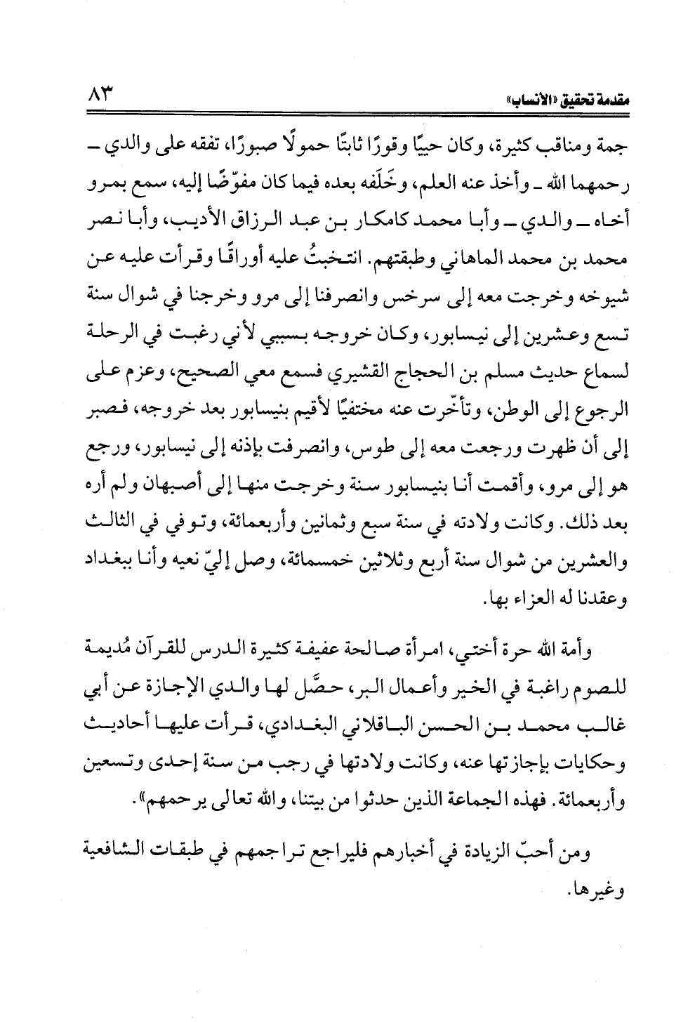 جمة ومناقب كثيرة، وكان حييًا وقورًا ثابتًا حمولًا صبورًا، تفقه على والدي ــ رحمهما الله ــ وأخذ عنه العلم، وخَلَفه بعده فيما كان مفوّضًا إليه، سمع بمرو أخاه ــ والدي ــ وأبا محمد كامكار بن عبد الرزاق الأديب، وأبا نصر محمد بن محمد الماهاني وطبقتهم. انتخبتُ عليه أوراقًا وقرأت عليه عن شيوخه وخرجت معه إلى سرخس وانصرفنا إلى مرو وخرجنا في شوال سنة تسع وعشرين إلى نيسابور، وكان خروجه بسببي لأني رغبت في الرحلة لسماع حديث مسلم بن الحجاج القشيري فسمع معي الصحيح، وعزم على الرجوع إلى الوطن، وتأخّرت عنه مختفيًا لأقيم بنيسابور بعد خروجه، فصبر إلى أن ظهرت ورجعت معه إلى طوس، وانصرفت بإذنه إلى نيسابور، ورجع هو إلى مرو، وأقمت أنا بنيسابور سنة وخرجت منها إلى أصبهان ولم أره بعد ذلك. وكانت ولادته في سنة سبع وثمانين وأربعمائة، وتوفي في الثالث والعشرين من شوال سنة أربع وثلاثين خمسمائة، وصل إليّ نعيه وأنا ببغداد وعقدنا له العزاء بها.