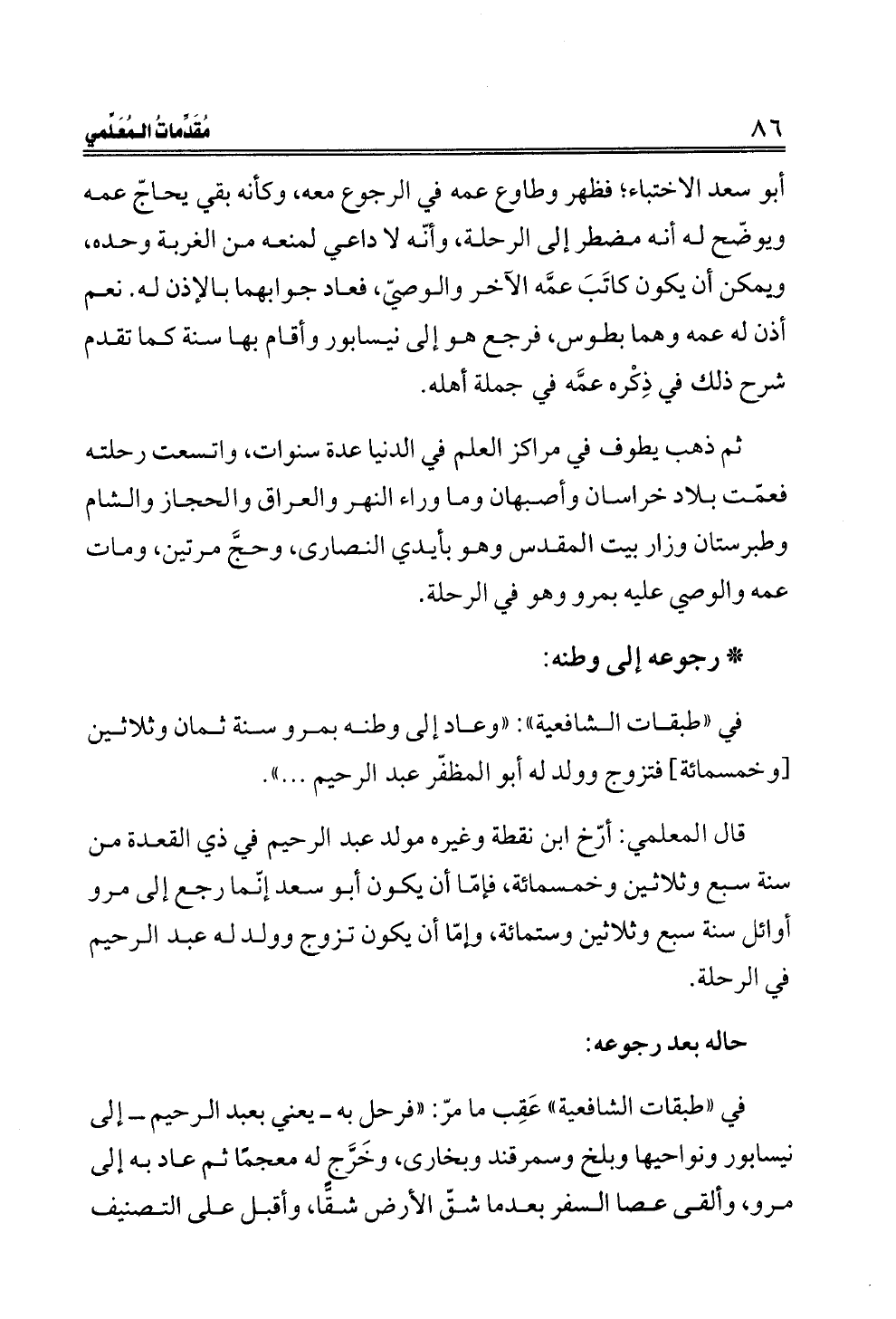 قال المعلمي: أرّخ ابن نقطة وغيره مولد عبد الرحيم في ذي القعدة من سنة سبع وثلاثين وخمسمائة، فإمّا أن يكون أبو سعد إنّما رجع إلى مرو أوائل سنة سبع وثلاثين وستمائة، وإمّا أن يكون تزوج وولد له عبد الرحيم في الرحلة.