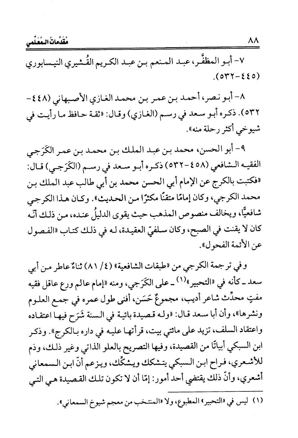 وفي ترجمة الكرجي من "طبقات الشافعية" (٤/ ٨١) ثناءٌ عاطر من أبي سعد ــ كأنه في "التحبير" (¬١) ــ على الكَرَجي، ومنه "إمام عالم ورع عاقل فقيه مفتٍ محدِّث شاعر أديب، مجموعٌ حَسَن، أفنى طول عمره في جمع العلوم ونشرها"، وأن أبا سعد قال: "وله قصيدة بائية في السنة شَرَح فيها اعتقاده واعتقاد السلف، تزيد على مائتي بيت، قرأتها عليه في داره بالكرج". وذكر ابن السبكي أبياتًا من القصيدة، وفيها التصريح بالعلو الذاتي وغير ذلك، وذم للأشعري، فراح ابن السبكي يتشكك ويشكِّك، ويزعم أنّ ابن السمعاني أشعري، وأنّ ذلك يقتضي أحد أمور: إمّا أن لا تكون تلك القصيدة هي التي