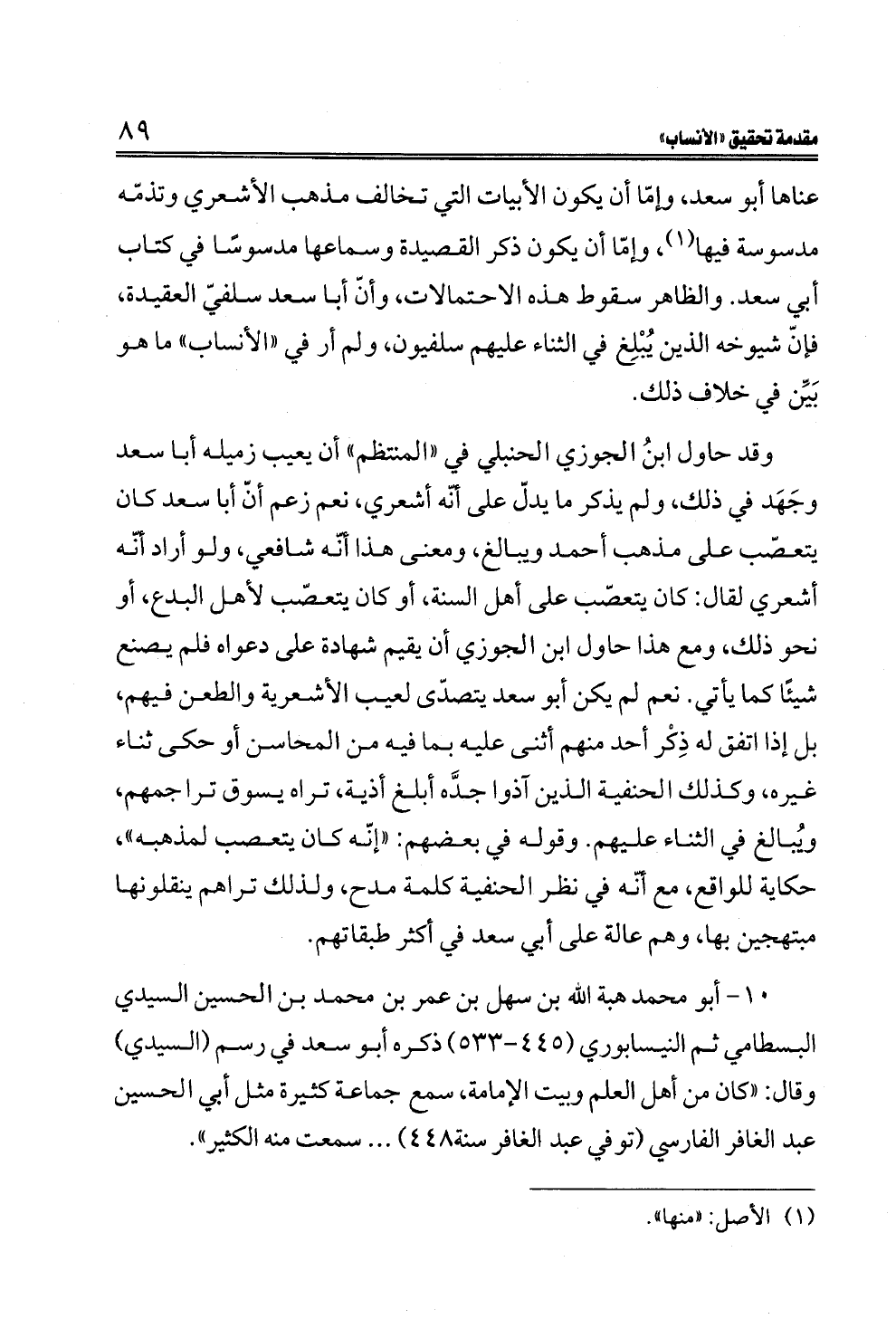 عناها أبو سعد، وإمّا أن يكون الأبيات التي تخالف مذهب الأشعري وتذمّه مدسوسة فيها (¬١)، وإمّا أن يكون ذكر القصيدة وسماعها مدسوسًا في كتاب أبي سعد. والظاهر سقوط هذه الاحتمالات، وأنّ أبا سعد سلفيّ العقيدة، فإنّ شيوخه الذين يُبْلِغ في الثناء عليهم سلفيون، ولم أر في "الأنساب" ما هو بَيِّن في خلاف ذلك.