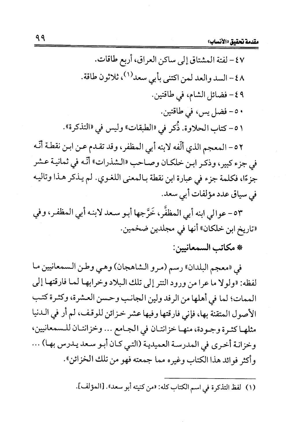 ٥٢ - المعجم الذي ألّفه لابنه أبي المظفر، وقد تقدم عن ابن نقطة أنّه في جزء كبير، وذكر ابن خلكان وصاحب "الشذرات" أنّه في ثمانية عشر جزءًا، فكلمة جزء في عبارة ابن نقطة بالمعنى اللغوي. لم يذكر هذا وتاليه في سياق عدد مؤلفات أبي سعد.