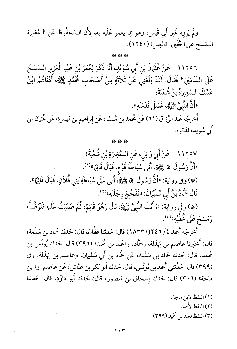 ١١٢٥٦ - عن عثمان بن أبي سويد، أنه ذكر لعمر بن عبد العزيز المسح على القدمين؟ فقال: لقد بلغني عن ثلاثة من أصحاب محمد صَلى الله عَليه وسَلم أدناهم ابن عمك المغيرة بن شعبة؛