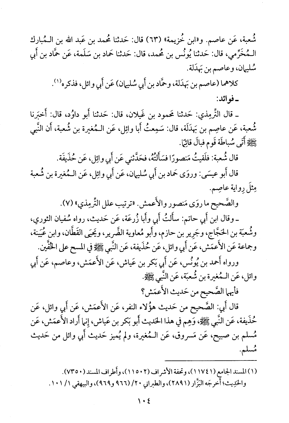 - قال التِّرمِذي: حدثنا محمود بن غَيلان، قال: حدثنا أَبو داود، قال: أخبرنا شعبة، عن عاصم بن بهدلة، قال: سمعت أبا وائل، عن المغيرة بن شعبة، أن النبي صَلى الله عَليه وسَلم أتى سباطة قوم فبال قائما.