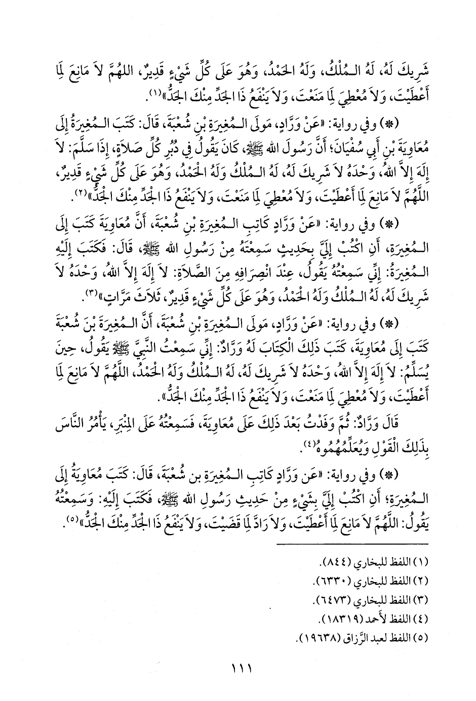 - وفي رواية: «عن وراد كاتب المغيرة بن شعبة، قال: كتب معاوية إلى المغيرة؛ أن اكتب إلي بشيء من حديث رسول الله صَلى الله عَليه وسَلم فكتب إليه: وسمعته يقول: اللهم لا مانع لما أعطيت، ولا راد لما قضيت، ولا ينفع ذا الجد منك الجد» (¬٢).