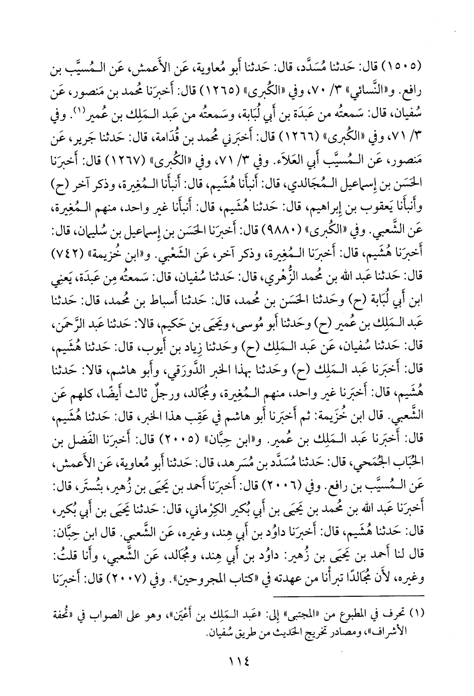 وفي ٣/ ٧١، وفي «الكبرى» (١٢٦٧) قال: أخبرنا الحسن بن إسماعيل المجالدي، قال: أنبأنا هُشيم، قال: أنبأنا المغيرة، وذكر آخر (ح) وأنبأنا يعقوب بن إبراهيم، قال: حدثنا هُشيم، قال: أنبأنا غير واحد، منهم المغيرة، عن الشعبي. وفي «الكبرى» (٩٨٨٠) قال: أخبرنا الحسن بن إسماعيل بن سليمان، قال: أخبرنا هُشيم، قال: أخبرنا المغيرة، وذكر آخر، عن الشعبي. و «ابن خزيمة» (٧٤٢) قال: حدثنا عبد الله بن محمد الزُّهْري، قال: حدثنا سفيان، قال: سمعته من عبدة، يعني ابن أبي لبابة (ح) وحدثنا الحسن بن محمد، قال: حدثنا أسباط بن محمد، قال: حدثنا عبد الملك بن عمير (ح) وحدثنا أَبو موسى، ويحيى بن حكيم، قالا: حدثنا عبد الرَّحمَن، قال: حدثنا سفيان، عن عبد الملك (ح) وحدثنا زياد بن أيوب، قال: حدثنا هُشيم، قال: أخبرنا عبد الملك (ح) وحدثنا بهذا الخبر الدورقي، وأَبو هاشم، قالا: حدثنا هُشيم، قال: أخبرنا غير واحد، منهم المغيرة، ومجالد، ورجل ثالث أيضا، كلهم عن الشعبي. قال ابن خزيمة: ثم أخبرنا أَبو هاشم في عقب هذا الخبر، قال: حدثنا هُشيم، قال: أخبرنا عبد الملك بن عمير. و «ابن حِبَّان» (٢٠٠٥) قال: أخبرنا الفضل بن الحُبَاب الجُمحي، قال: حدثنا مُسَدد بن مُسَرهد، قال: حدثنا أَبو معاوية، عن الأعمش، عن المُسَيَّب بن رافع. وفي (٢٠٠٦) قال: أخبرنا أحمد بن يحيى بن زهير، بتستر، قال: أخبرنا عبد الله بن محمد بن يحيى بن أبي بكير الكرماني، قال: حدثنا يحيى بن أبي بكير، قال: حدثنا هُشيم، قال: أخبرنا داود بن أبي هند، وغيره، عن الشعبي. قال ابن حبان: قال لنا أحمد بن يحيى بن زهير: داود بن أبي هند، ومجالد، عن الشعبي، وأنا قلت: وغيره، لأن مجالدا تبرأنا من عهدته في «كتاب المجروحين». وفي (٢٠٠٧) قال: أخبرنا