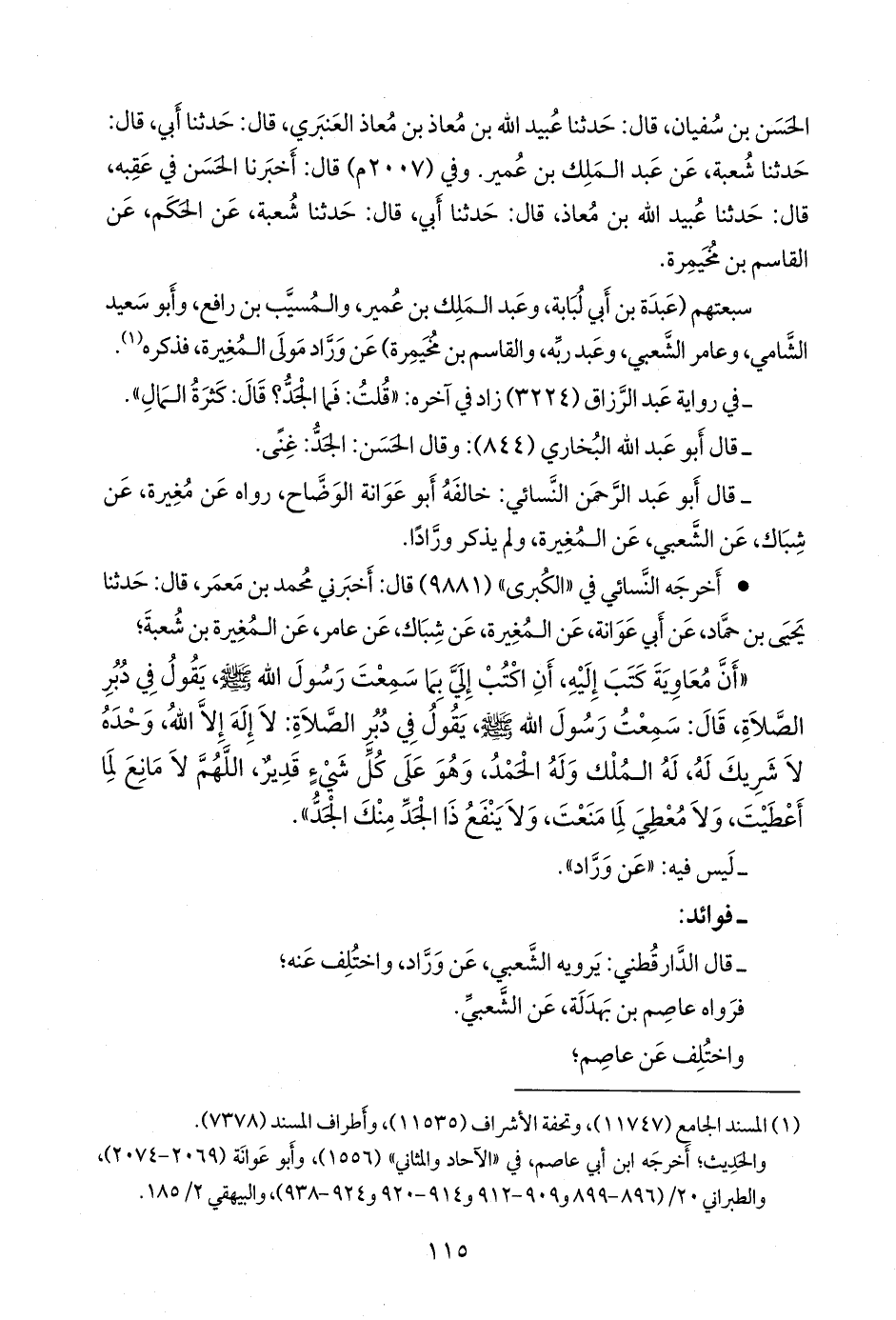 - قال أَبو عبد الرَّحمَن النَّسَائي: خالفه أَبو عَوانة الوضاح، رواه عن مغيرة، عن شباك، عن الشعبي، عن المغيرة، ولم يذكر ورادا.