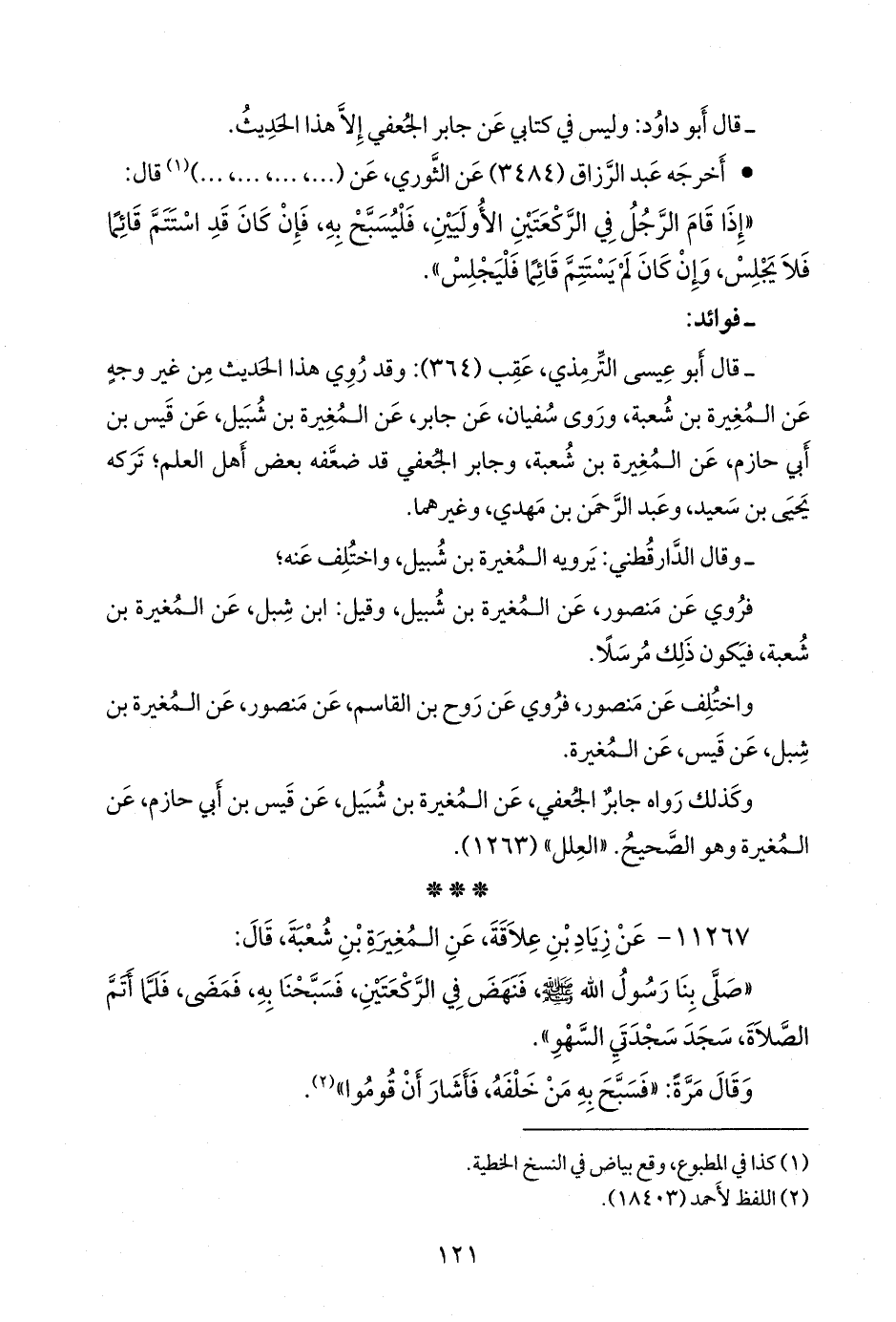 - وفي رواية: «عن زياد بن عِلاقة، قال: صلى بنا المغيرة بن شعبة، فلما صلى ركعتين قام ولم يجلس، فسبح به من خلفه، فأشار إليهم أن قوموا، فلما فرغ من صلاته سلم، وسجد سجدتي السهو وسلم، وقال: هكذا صنع رسول الله صَلى الله عَليه وسَلم» (¬٢).