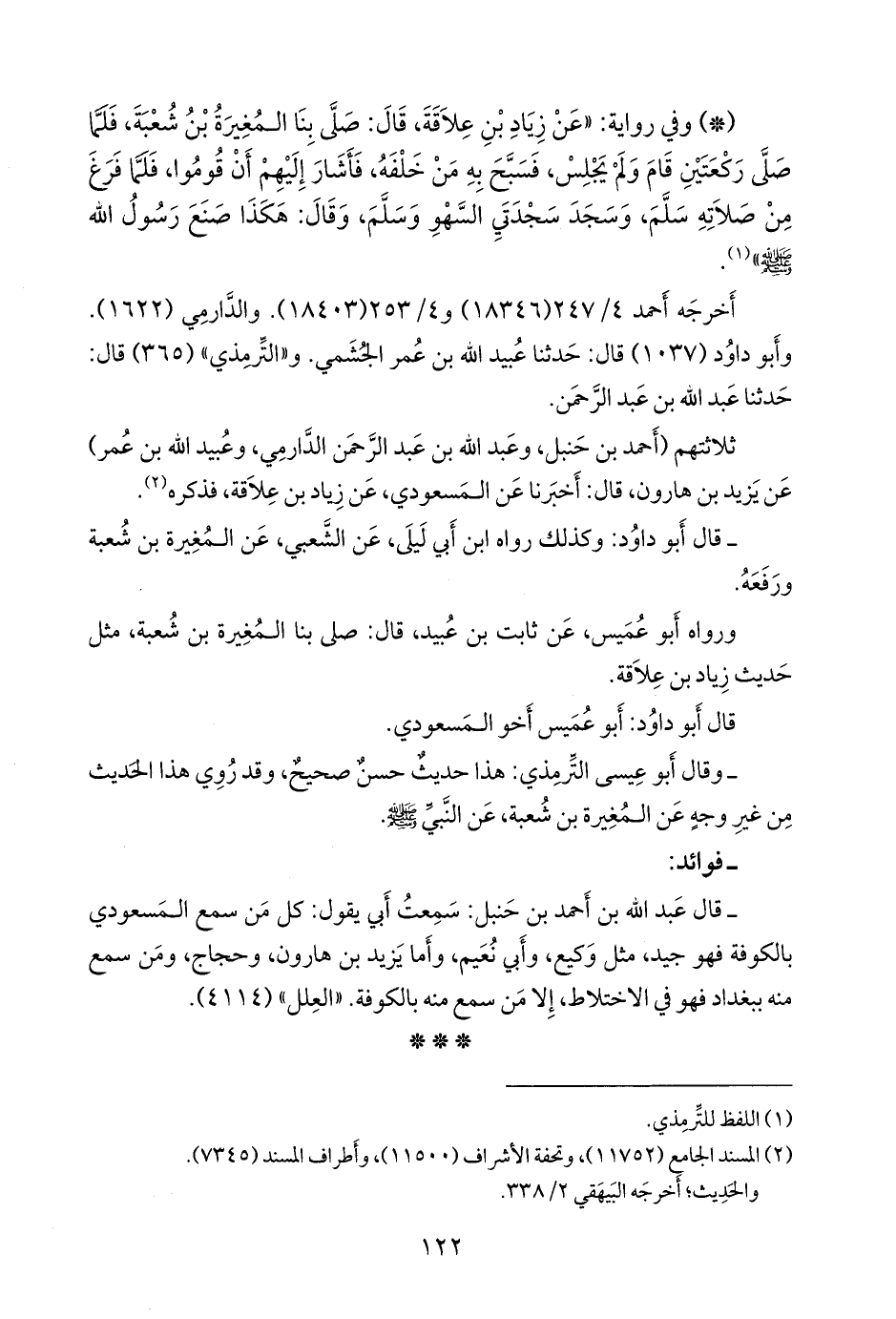 ثلاثتهم (أحمد بن حنبل، وعبد الله بن عبد الرَّحمَن الدَّارِمي، وعُبيد الله بن عمر) عن يزيد بن هارون، قال: أخبرنا عن المَسعودي، عن زياد بن عِلاقة، فذكره (¬١).