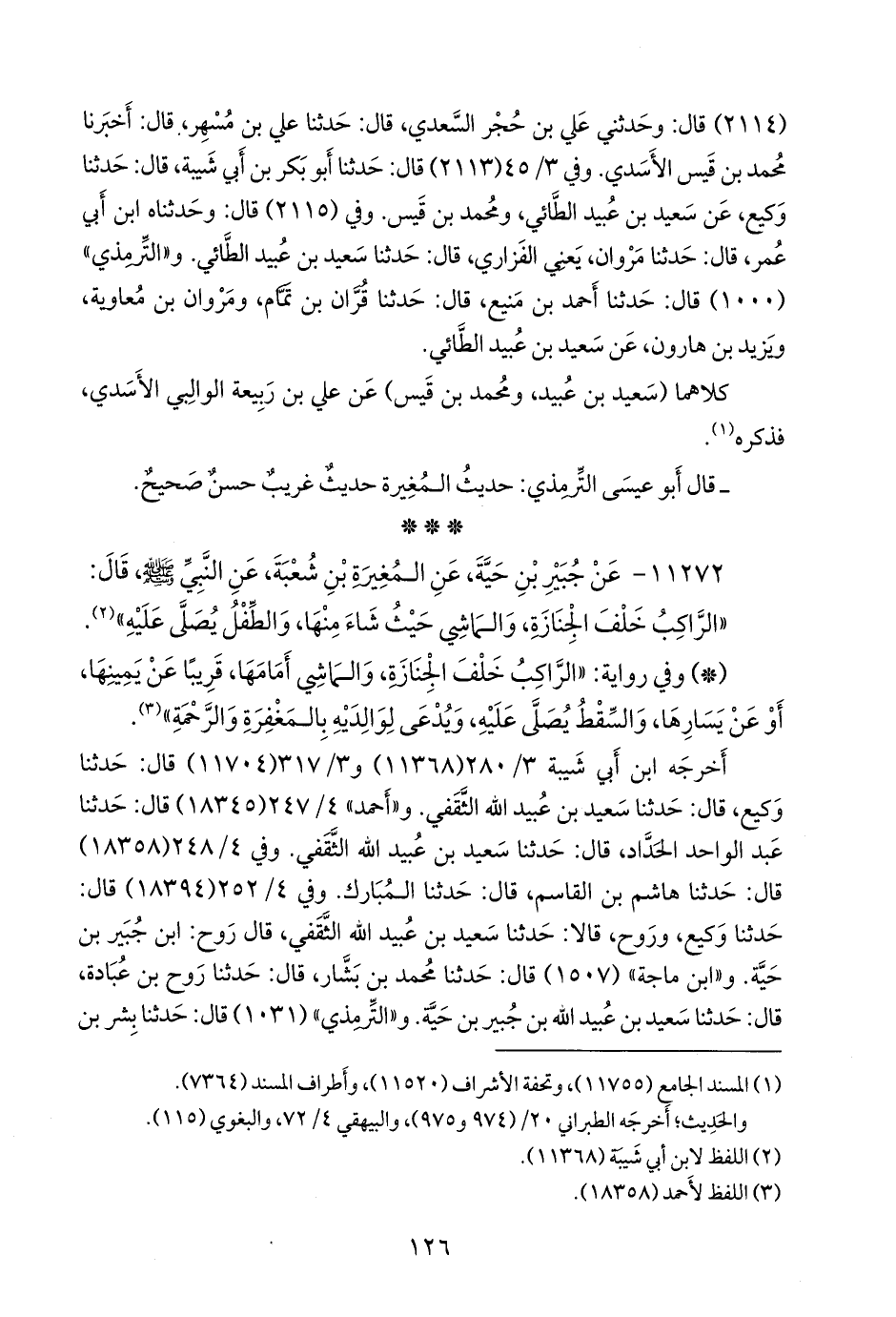أخرجه ابن أبي شيبة (١١٣٦٨) و ٣/ ٣١٧ (١١٧٠٤) قال: حدثنا وكيع، قال: حدثنا سعيد بن عُبيد الله الثقفي. و «أحمد» ٤/ ٢٤٧ (١٨٣٤٥) قال: حدثنا عبد الواحد الحداد، قال: حدثنا سعيد بن عُبيد الله الثقفي. وفي ٤/ ٢٤٨ (١٨٣٥٨) قال: حدثنا هاشم بن القاسم، قال: حدثنا المبارك. وفي ٤/ ٢٥٢ (١٨٣٩٤) قال: حدثنا وكيع، وروح، قالا: حدثنا سعيد بن عُبيد الله الثقفي، قال روح: ابن جبير بن حية. و «ابن ماجة» (١٥٠٧) قال: حدثنا محمد بن بشار، قال: حدثنا روح بن عبادة، قال: حدثنا سعيد بن عُبيد الله بن جبير بن حية. و «التِّرمِذي» (١٠٣١) قال: حدثنا بشر بن