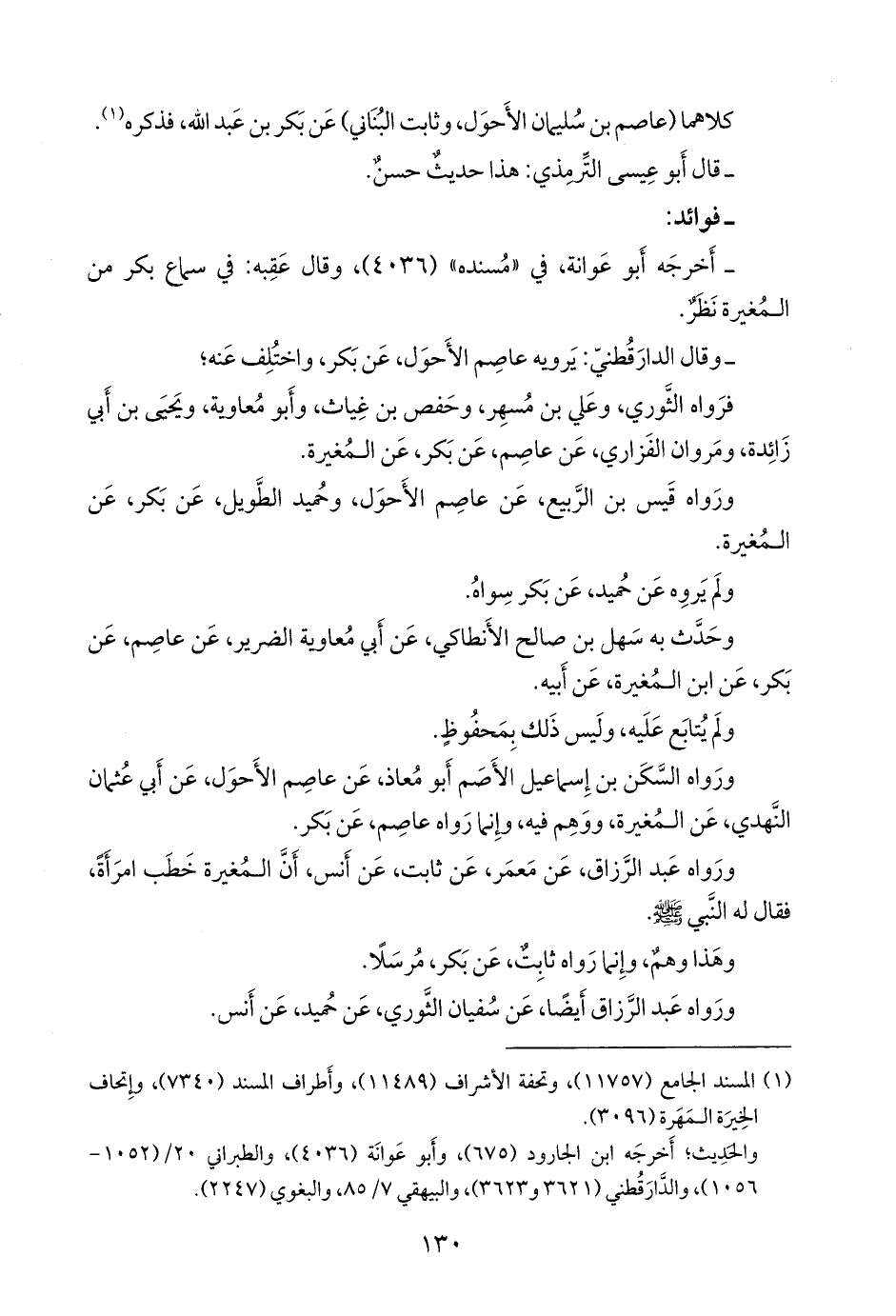 فرواه الثوري، وعلي بن مُسهِر، وحفص بن غياث، وأَبو معاوية، ويحيى بن أبي زائدة، ومروان الفزاري، عن عاصم، عن بكر، عن المغيرة.
