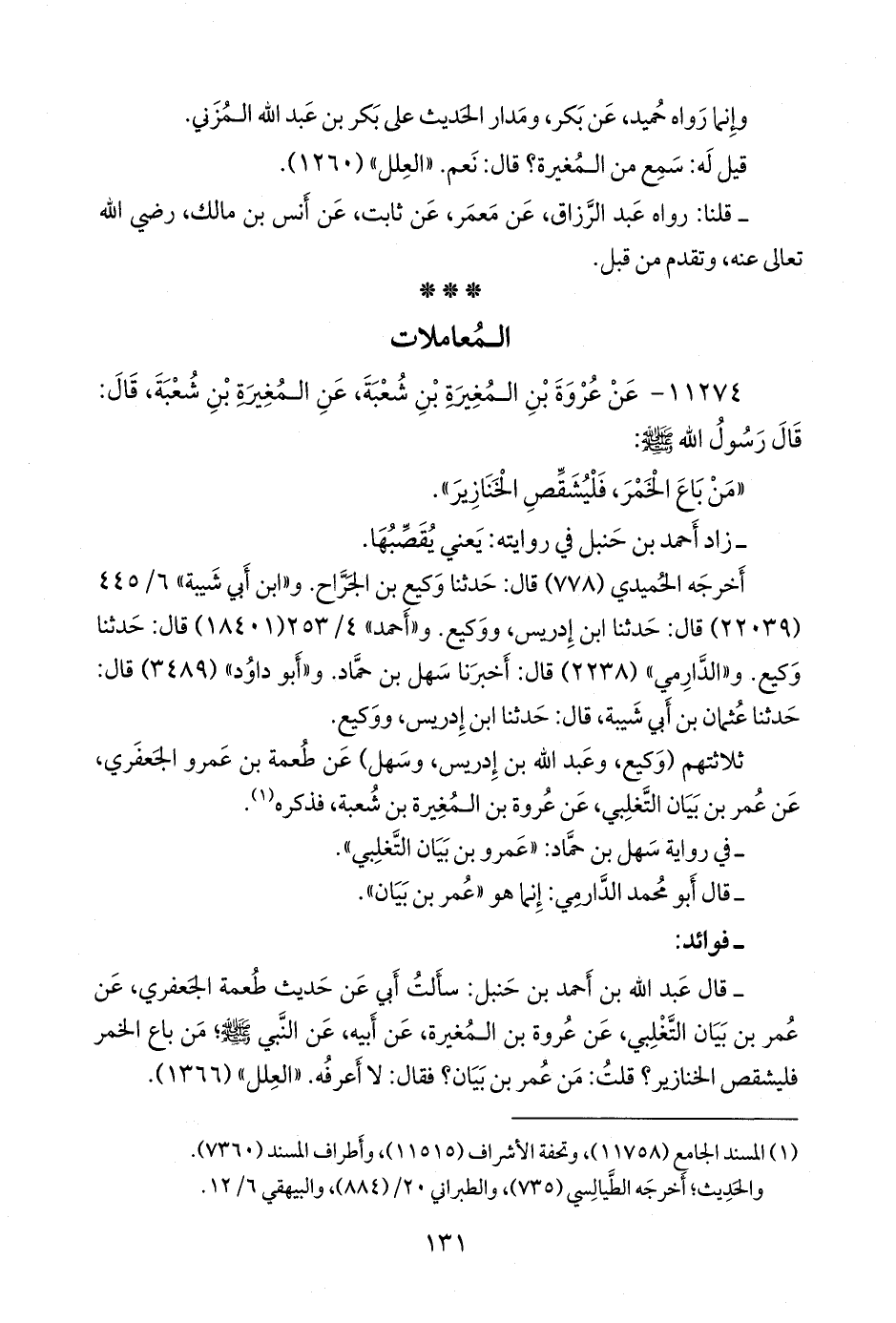 ثلاثتهم (وكيع، وعبد الله بن إدريس، وسهل) عن طعمة بن عَمرو الجعفري، عن عمر بن بيان التغلبي، عن عروة بن المغيرة بن شعبة، فذكره (¬١).