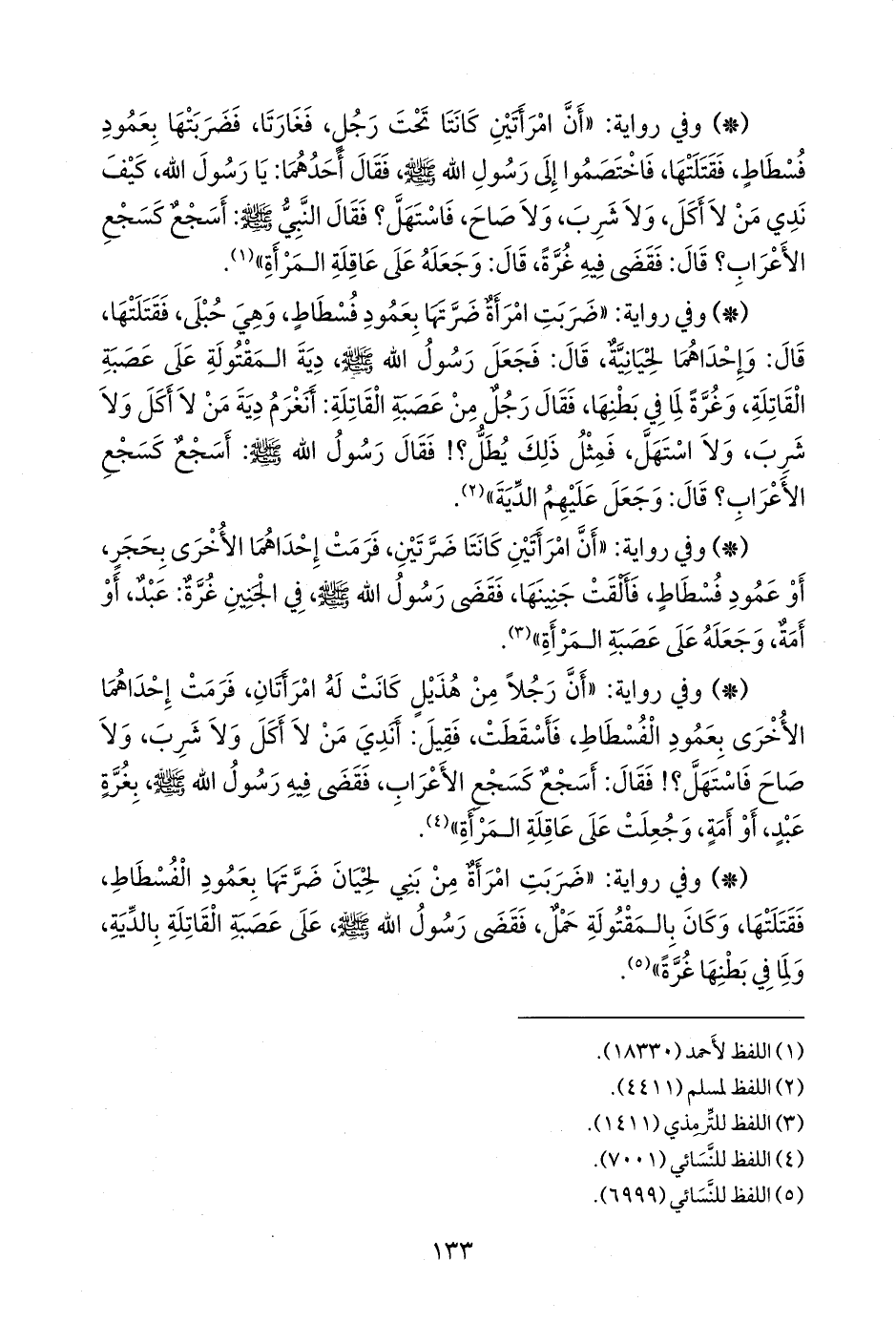 - وفي رواية: «ضربت امرأة من بني لحيان ضرتها بعمود الفسطاط، فقتلتها، وكان بالمقتولة حمل، فقضى رسول الله صَلى الله عَليه وسَلم على عصبة القاتلة بالدية، ولما في بطنها غرة» (¬٢).