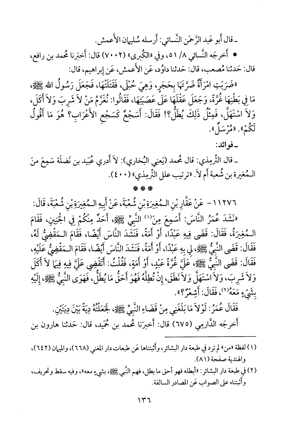 «نشد عمر الناس: سمع من النبي صَلى الله عَليه وسَلم، أحد منكم في الجنين، فقام المغيرة، فقال: قضى فيه عبدًا أو أمة، فنشد الناس أيضا، فقام المقضي له، فقال: قضى النبي صَلى الله عَليه وسَلم لي به: عبدًا أو أمة، فنشد الناس أيضا، فقام المقضي عليه، فقال: قضى النبي صَلى الله عَليه وسَلم، علي غرة: عبدًا أو أمة، فقال: أتقضي علي فيه فيما لا أكل ولا شرب، ولا استهل ولا نطق، أبطله فهو أحق ما بطل، فهم النبي صَلى الله عَليه وسَلم، إليه بشيء معه، فقال: أشعر؟».