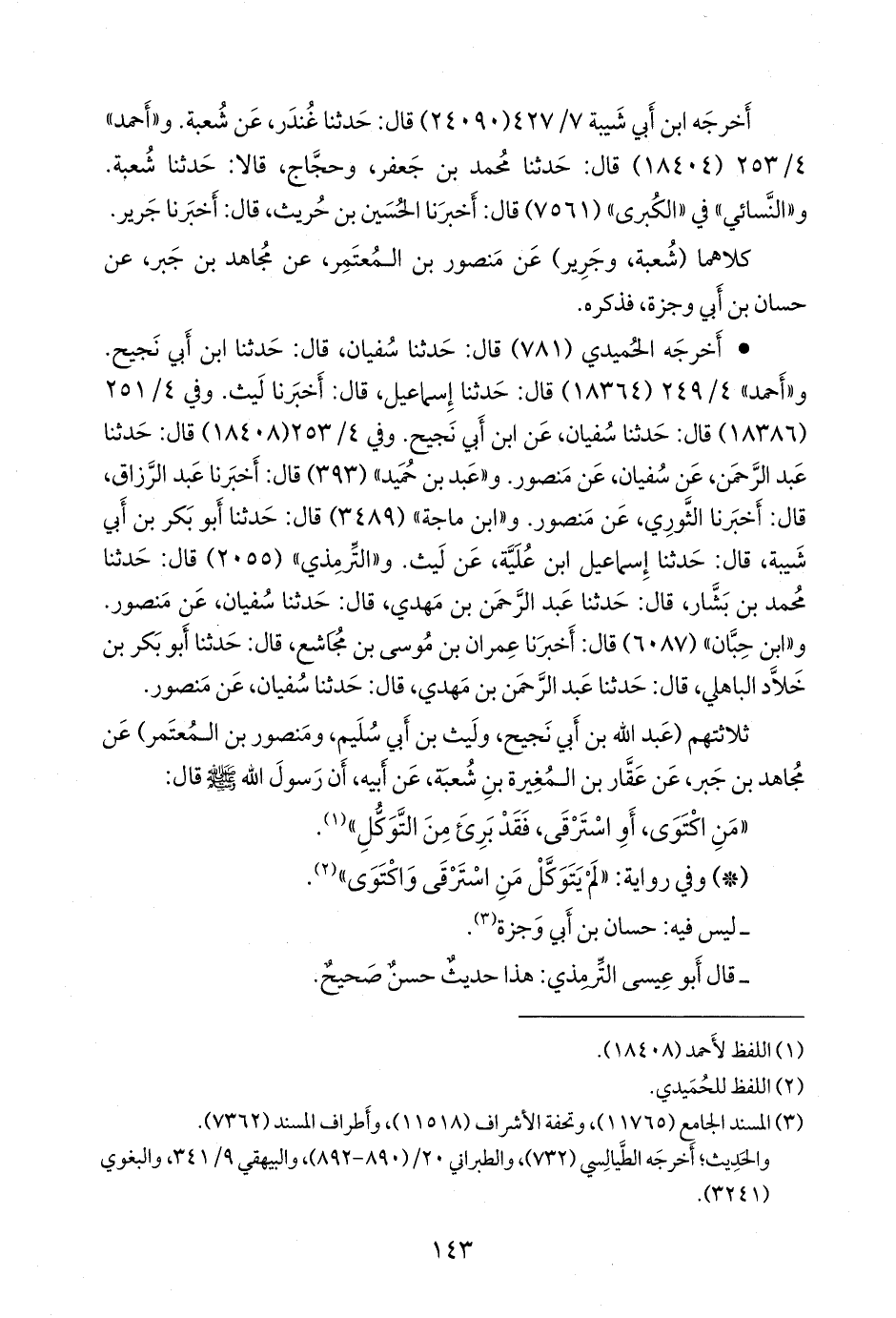 وفي ٤/ ٢٥٣ (١٨٤٠٨) قال: حدثنا عبد الرَّحمَن، عن سفيان، عن منصور. و «عَبد بن حُميد» (٣٩٣) قال: أخبرنا عبد الرزاق، قال: أخبرنا الثوري، عن منصور. و «ابن ماجة» (٣٤٨٩) قال: حدثنا أَبو بكر بن أبي شيبة، قال: حدثنا إسماعيل ابن عُلَية، عن ليث. و «التِّرمِذي» (٢٠٥٥) قال: حدثنا محمد بن بشار، قال: حدثنا عبد الرَّحمَن بن مهدي، قال: حدثنا سفيان، عن منصور. و «ابن حِبَّان» (٦٠٨٧) قال: أخبرنا عمران بن موسى بن مجاشع، قال: حدثنا أَبو بكر بن خلاد الباهلي، قال: حدثنا عبد الرَّحمَن بن مهدي، قال: حدثنا سفيان، عن منصور.