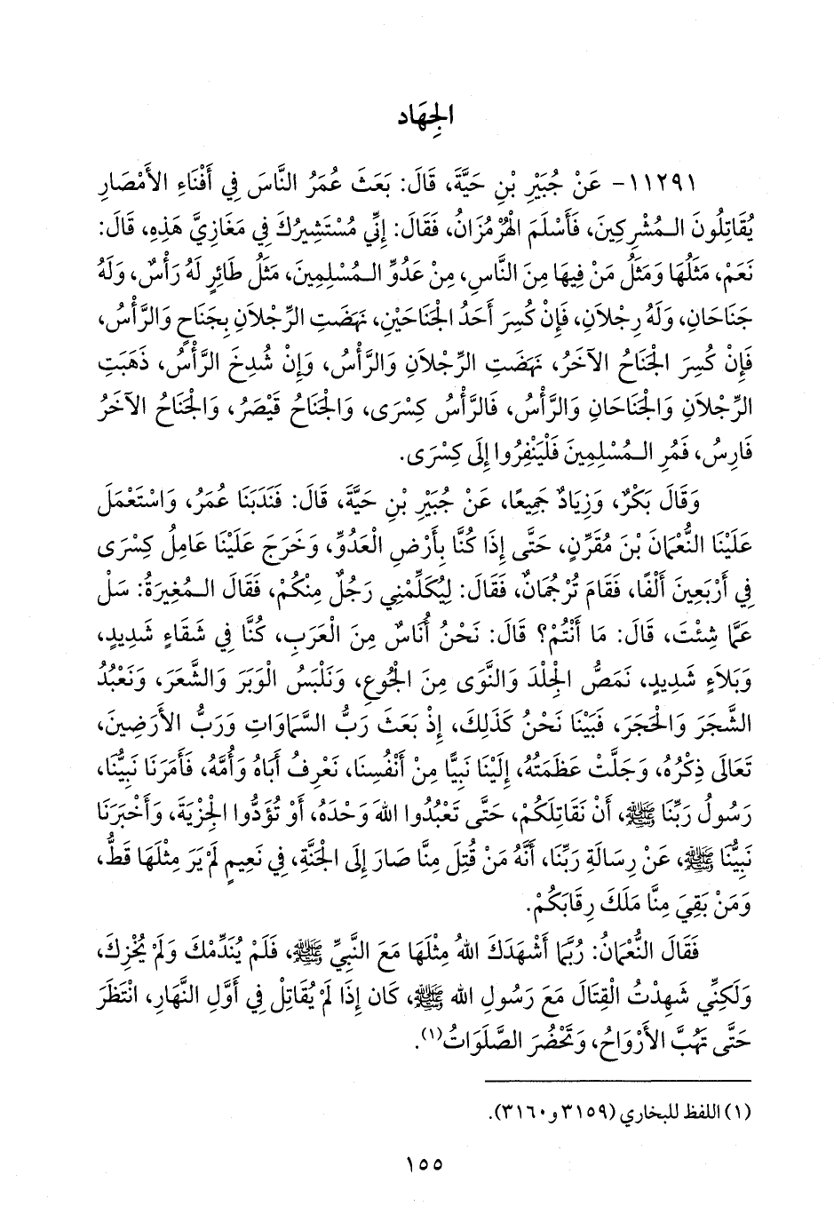 ١١٢٩١ - عن جبير بن حية، قال: بعث عمر الناس في أفناء الأمصار يقاتلون المشركين، فأسلم الهرمزان، فقال: إني مستشيرك في مغازي هذه، قال: نعم، مثلها ومثل من فيها من الناس، من عدو المسلمين، مثل طائر له رأس، وله جناحان، وله رجلان، فإن كسر أحد الجناحين، نهضت الرجلان بجناح والرأس، فإن كسر الجناح الآخر، نهضت الرجلان والرأس، وإن شدخ الرأس، ذهبت الرجلان والجناحان والرأس، فالرأس كسرى، والجناح قيصر، والجناح الآخر فارس، فمر المسلمين فلينفروا إلى كسرى.
