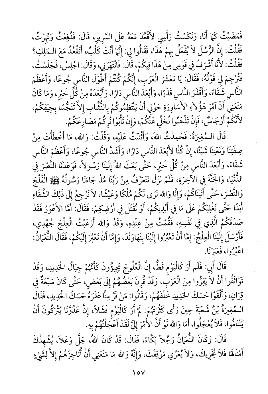 قال المغيرة: فحمدت الله، وأثنيت عليه، وقلت: والله، ما أخطأت من صفتنا ونعتنا شيئا، إن كنا لأبعد الناس دارا، وأشد الناس جوعا، وأعظم الناس شقاء، وأبعد الناس من كل خير، حتى بعث الله إلينا رسولا، فوعدنا النصر في الدنيا، والجنة في الآخرة، فلم نزل نتعرف من ربنا مذ جاءنا رسوله صَلى الله عَليه وسَلم الفلج والنصر، حتى أتيناكم، وإنا والله نرى لكم ملكا وعيشا، لا نرجع إلى ذلك الشقاء أبدا حتى نغلبكم على ما في أيديكم، أو نقتل في أرضكم، فقال: أما الأعور فقد صدقكم الذي في نفسه، فقمت من عنده، وقد والله أرعبت العلج جهدي، فأرسل إلينا العلج: إما أن تعبروا إلينا بنهاوند، وإما أن نعبر إليكم، فقال النعمان: اعبروا، فعبرنا.