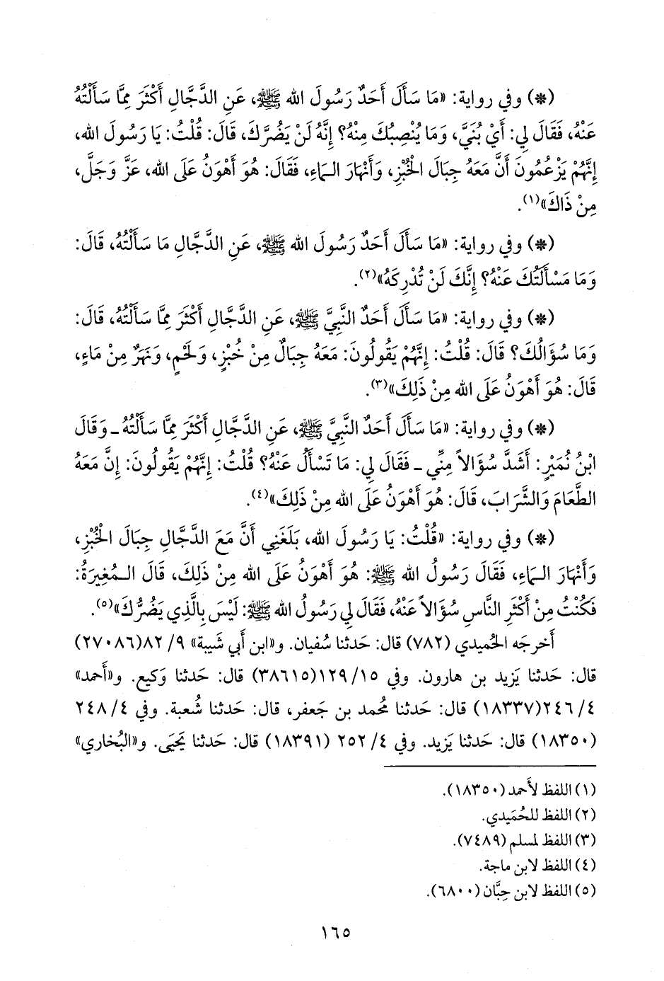 - وفي رواية: «ما سأل أحد النبي صَلى الله عَليه وسَلم عن الدجال أكثر مما سألته، وقال ابن نُمير: أشد سؤالا مني ـ فقال لي: ما تسأل عنه؟ قلت: إنهم يقولون: إن معه الطعام والشراب، قال: هو أهون على الله من ذلك» (¬١).
