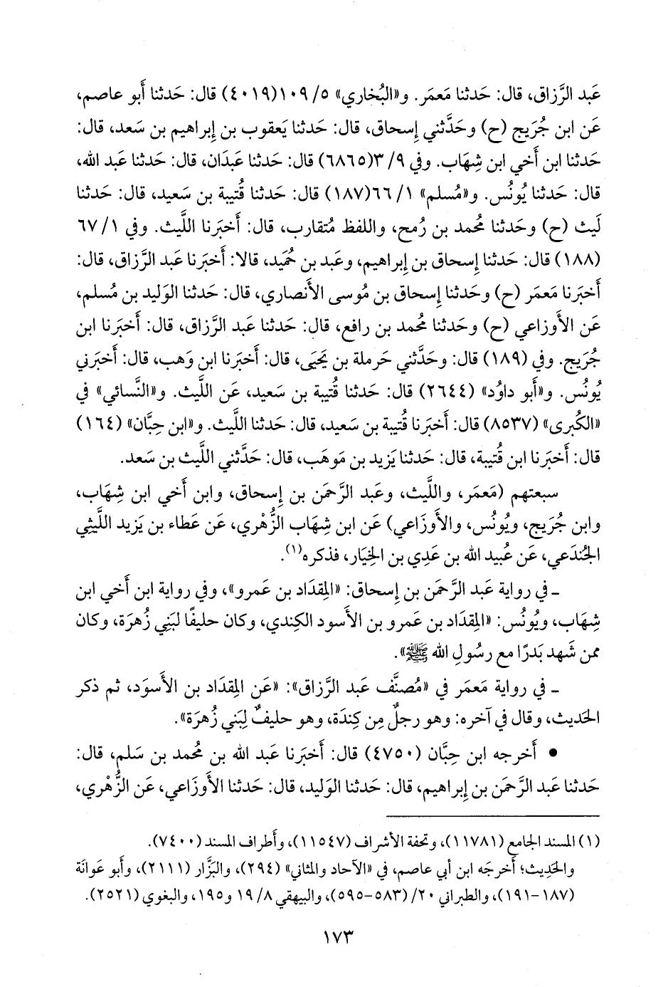 - في رواية معمر في «مصنف عبد الرزاق»: «عن المقداد بن الأسود، ثم ذكر الحديث، وقال في آخره: وهو رجل من كندة، وهو حليف لبني زُهرَة».