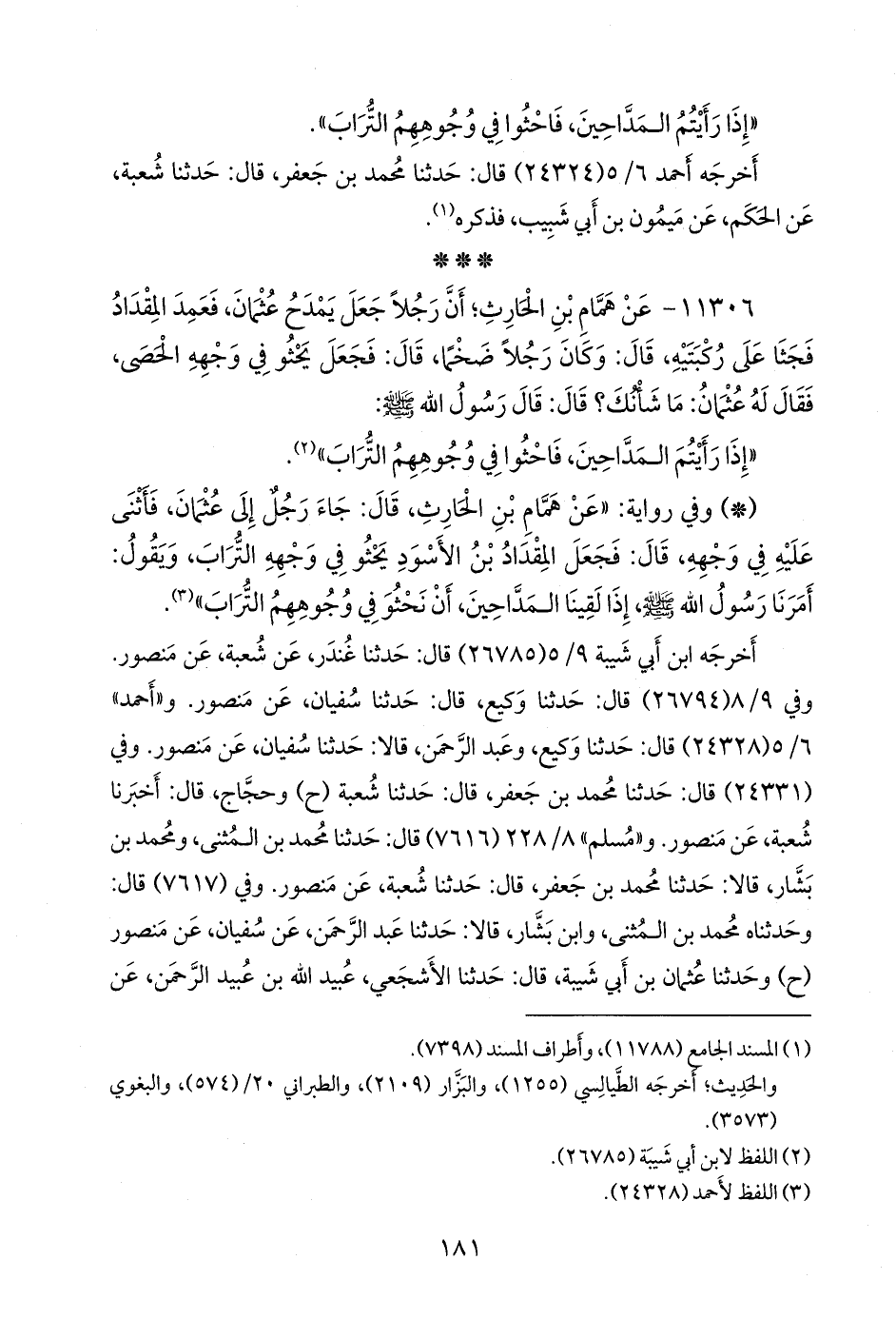 ١١٣٠٦ - عن همام بن الحارث؛ أن رجلا جعل يمدح عثمان، فعَمَد المقداد فجثا على ركبتيه، قال: وكان رجلا ضخما، قال: فجعل يحثو في وجهه الحصى، فقال له عثمان: ما شأنك؟ قال: قال رسول الله صَلى الله عَليه وسَلم: