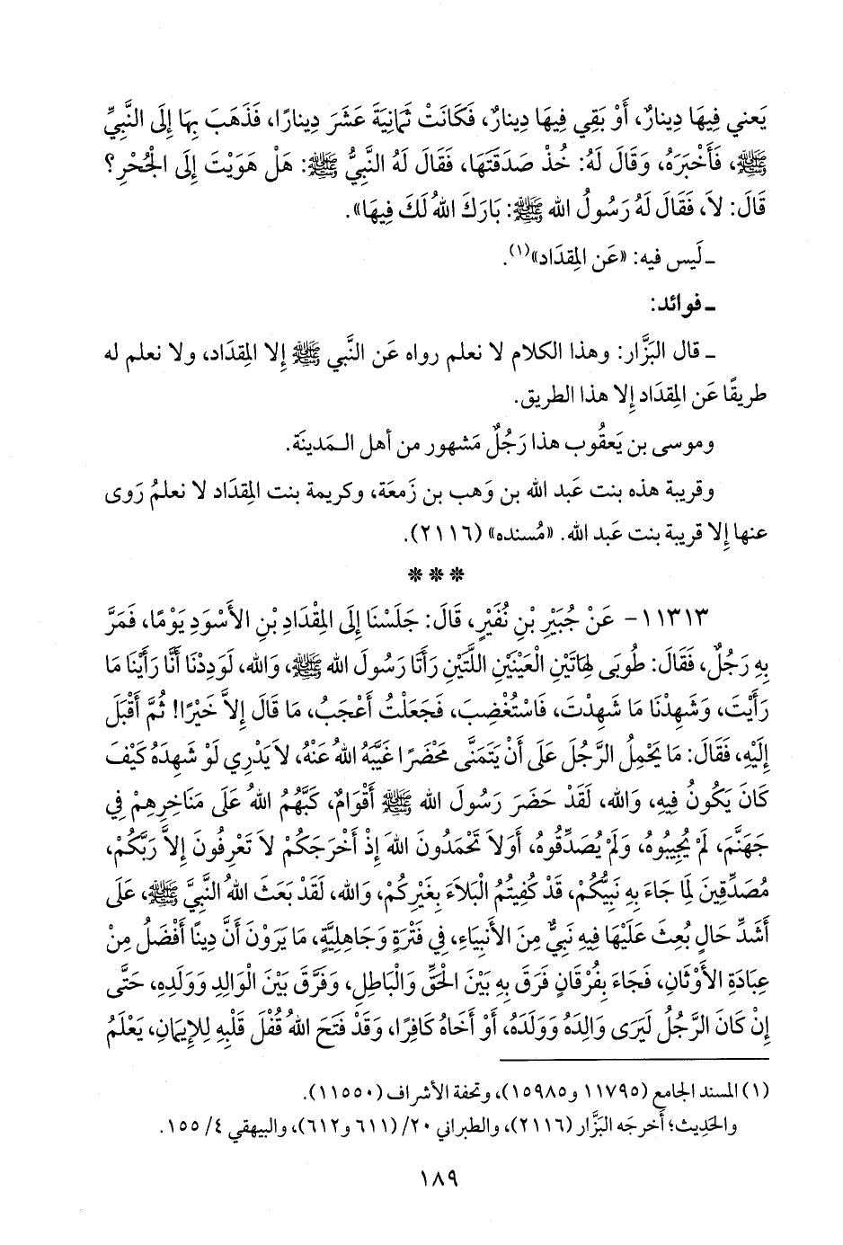 - وقال البزار: وهذا الكلام لا نعلم رواه عن النبي صَلى الله عَليه وسَلم إلا المقداد، ولا نعلم له طريقا عن المقداد إلا هذا الطريق.