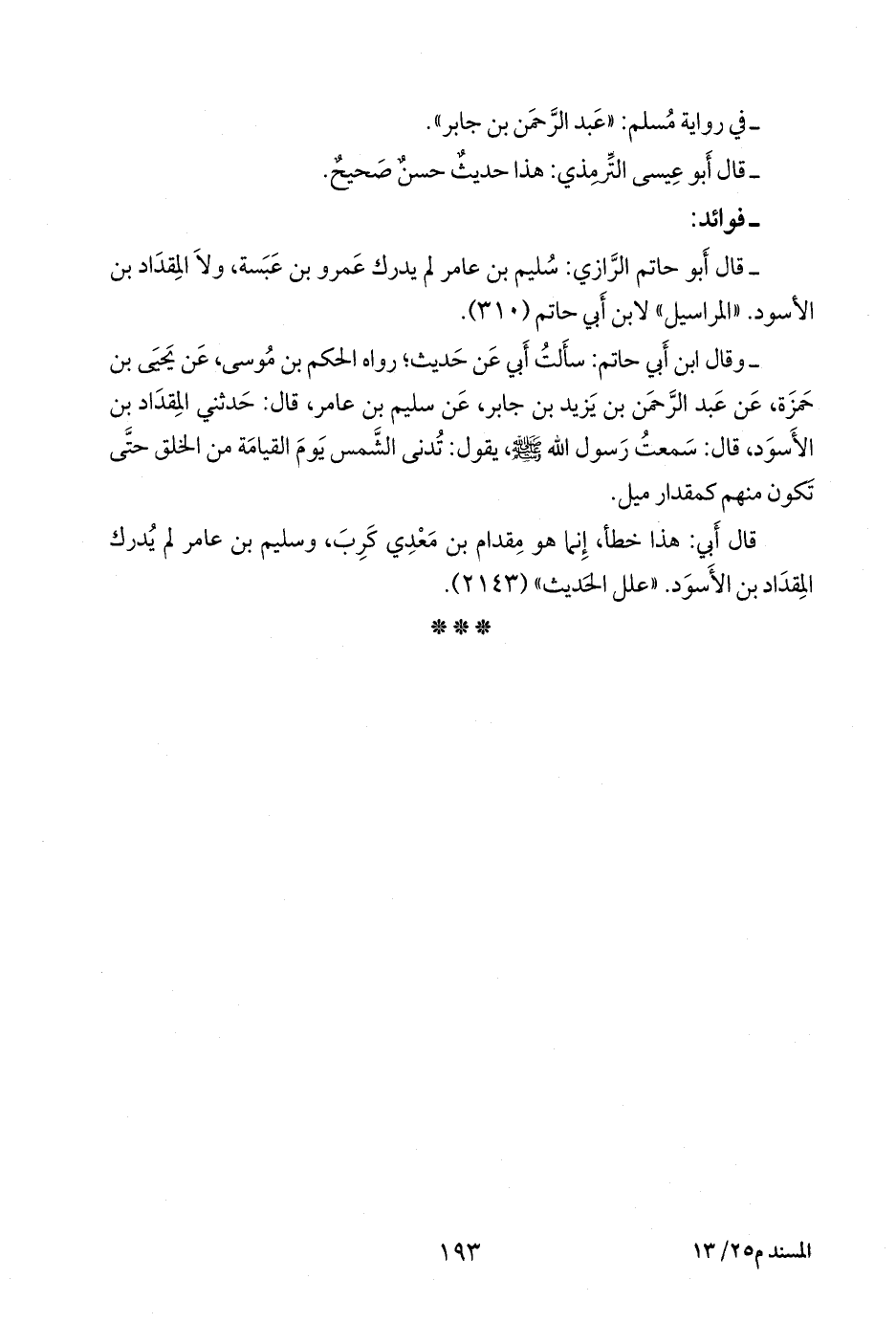 - قال ابن أبي حاتم: سألت أبي عن حديث؛ رواه الحكم بن موسى، عن يحيى بن حمزة، عن عبد الرَّحمَن بن يزيد بن جابر، عن سليم بن عامر، قال: حدثني المقداد بن الأسود، قال: سمعت رسول الله صَلى الله عَليه وسَلم يقول: تدنى الشمس يوم القيامة من الخلق حتى تكون منهم كمقدار ميل.
